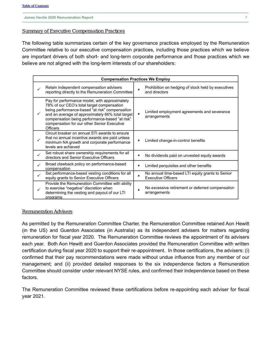 Table of Contents James Hardie 2020 Remuneration Report 7 Summary of Executive Compensation Practices The following table summarizes certain of the key governance practices employed by the Remuneration Committee relative to our executive compensation practices, including those practices which we believe are important drivers of both short- and long-term corporate performance and those practices which we believe are not aligned with the long-term interests of our shareholders: Compensation Practices We Employ Retain independent compensation advisers Prohibition on hedging of stock held by executives reporting directly to the Remuneration Committee and directors Pay for performance model, with approximately 78% of our CEO’s total target compensation being performance-based “at risk” compensation Limited employment agreements and severance and an average of approximately 66% total target arrangements compensation being performance-based “at risk” compensation for our other Senior Executive Officers Circuit breaker on annual STI awards to ensure that no annual incentive awards are paid unless minimum NA growth and corporate performance Limited change-in-control benefits levels are achieved Set robust share ownership requirements for all directors and Senior Executive Officers No dividends paid on unvested equity awards Broad clawback policy on performance-based Limited perquisites and other benefits compensation Set performance-based vesting conditions for all No annual time-based LTI equity grants to Senior equity grants to Senior Executive Officers Executive Officers Provide the Remuneration Committee with ability No excessive retirement or deferred compensation to exercise “negative” discretion when determining the vesting and payout of our LTI arrangements programs Remuneration Advisers As permitted by the Remuneration Committee Charter, the Remuneration Committee retained Aon Hewitt (in the US) and Guerdon Associates (in Australia) as its independent advisers for matters regarding remuneration for fiscal year 2020. The Remuneration Committee reviews the appointment of its advisers each year. Both Aon Hewitt and Guerdon Associates provided the Remuneration Committee with written certification during fiscal year 2020 to support their re-appointment. In those certifications, the advisers: (i) confirmed that their pay recommendations were made without undue influence from any member of our management; and (ii) provided detailed responses to the six independence factors a Remuneration Committee should consider under relevant NYSE rules, and confirmed their independence based on these factors. The Remuneration Committee reviewed these certifications before re-appointing each adviser for fiscal year 2021.