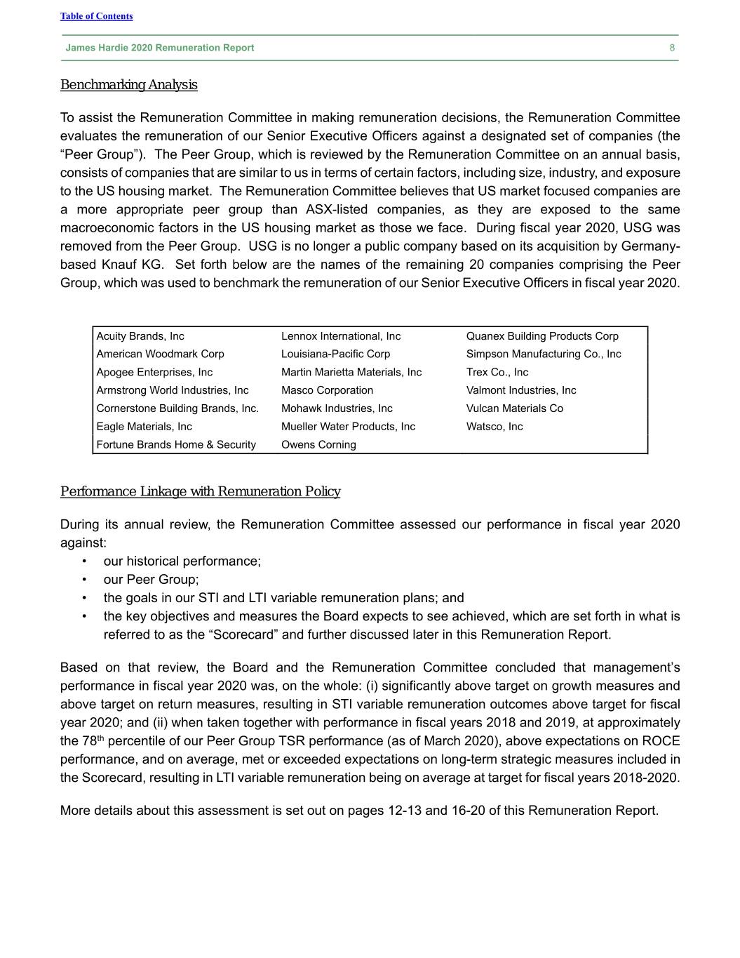 Table of Contents James Hardie 2020 Remuneration Report 8 Benchmarking Analysis To assist the Remuneration Committee in making remuneration decisions, the Remuneration Committee evaluates the remuneration of our Senior Executive Officers against a designated set of companies (the “Peer Group”). The Peer Group, which is reviewed by the Remuneration Committee on an annual basis, consists of companies that are similar to us in terms of certain factors, including size, industry, and exposure to the US housing market. The Remuneration Committee believes that US market focused companies are a more appropriate peer group than ASX-listed companies, as they are exposed to the same macroeconomic factors in the US housing market as those we face. During fiscal year 2020, USG was removed from the Peer Group. USG is no longer a public company based on its acquisition by Germany- based Knauf KG. Set forth below are the names of the remaining 20 companies comprising the Peer Group, which was used to benchmark the remuneration of our Senior Executive Officers in fiscal year 2020. Acuity Brands, Inc Lennox International, Inc Quanex Building Products Corp American Woodmark Corp Louisiana-Pacific Corp Simpson Manufacturing Co., Inc Apogee Enterprises, Inc Martin Marietta Materials, Inc Trex Co., Inc Armstrong World Industries, Inc Masco Corporation Valmont Industries, Inc Cornerstone Building Brands, Inc. Mohawk Industries, Inc Vulcan Materials Co Eagle Materials, Inc Mueller Water Products, Inc Watsco, Inc Fortune Brands Home & Security Owens Corning Performance Linkage with Remuneration Policy During its annual review, the Remuneration Committee assessed our performance in fiscal year 2020 against: • our historical performance; • our Peer Group; • the goals in our STI and LTI variable remuneration plans; and • the key objectives and measures the Board expects to see achieved, which are set forth in what is referred to as the “Scorecard” and further discussed later in this Remuneration Report. Based on that review, the Board and the Remuneration Committee concluded that management’s performance in fiscal year 2020 was, on the whole: (i) significantly above target on growth measures and above target on return measures, resulting in STI variable remuneration outcomes above target for fiscal year 2020; and (ii) when taken together with performance in fiscal years 2018 and 2019, at approximately the 78th percentile of our Peer Group TSR performance (as of March 2020), above expectations on ROCE performance, and on average, met or exceeded expectations on long-term strategic measures included in the Scorecard, resulting in LTI variable remuneration being on average at target for fiscal years 2018-2020. More details about this assessment is set out on pages 12-13 and 16-20 of this Remuneration Report.