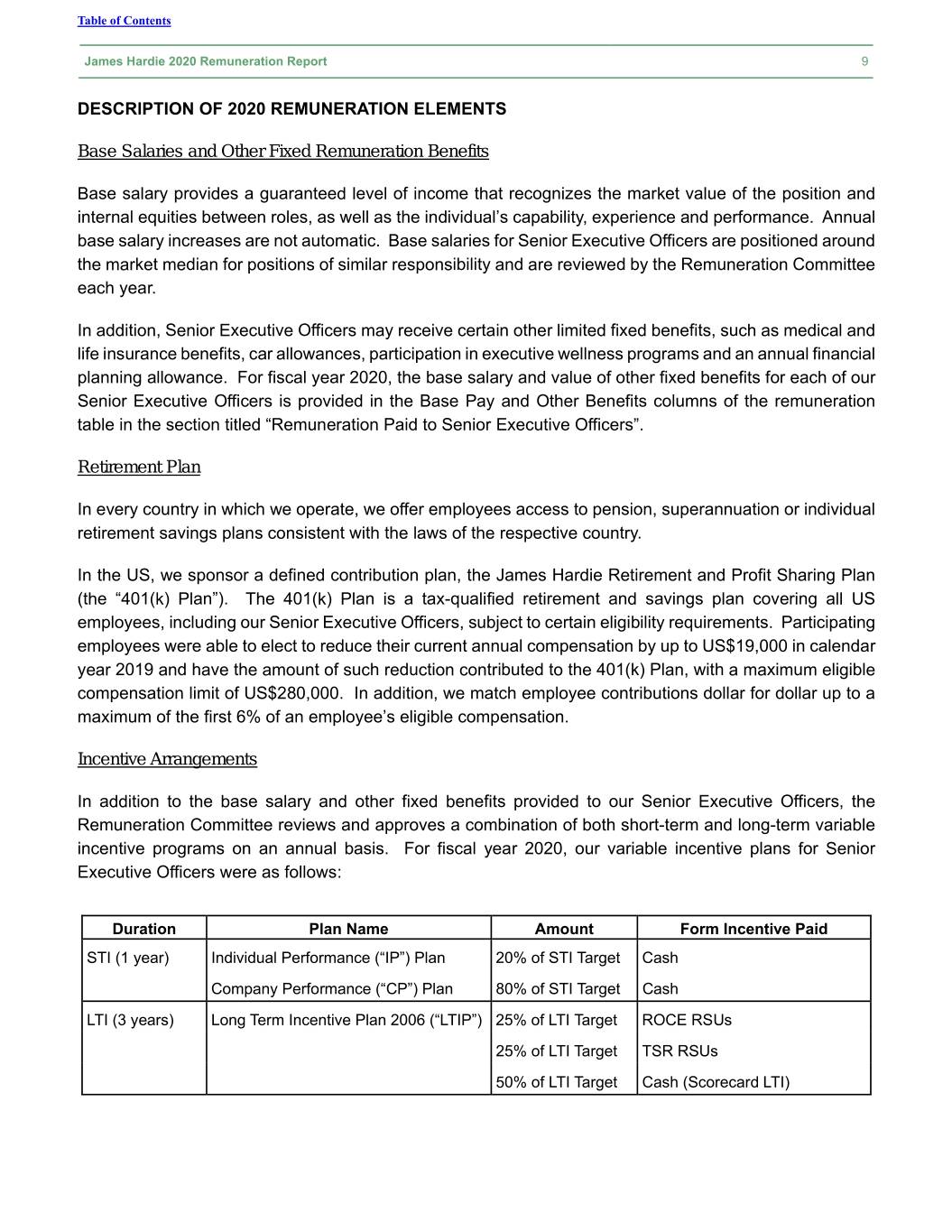Table of Contents James Hardie 2020 Remuneration Report 9 DESCRIPTION OF 2020 REMUNERATION ELEMENTS Base Salaries and Other Fixed Remuneration Benefits Base salary provides a guaranteed level of income that recognizes the market value of the position and internal equities between roles, as well as the individual’s capability, experience and performance. Annual base salary increases are not automatic. Base salaries for Senior Executive Officers are positioned around the market median for positions of similar responsibility and are reviewed by the Remuneration Committee each year. In addition, Senior Executive Officers may receive certain other limited fixed benefits, such as medical and life insurance benefits, car allowances, participation in executive wellness programs and an annual financial planning allowance. For fiscal year 2020, the base salary and value of other fixed benefits for each of our Senior Executive Officers is provided in the Base Pay and Other Benefits columns of the remuneration table in the section titled “Remuneration Paid to Senior Executive Officers”. Retirement Plan In every country in which we operate, we offer employees access to pension, superannuation or individual retirement savings plans consistent with the laws of the respective country. In the US, we sponsor a defined contribution plan, the James Hardie Retirement and Profit Sharing Plan (the “401(k) Plan”). The 401(k) Plan is a tax-qualified retirement and savings plan covering all US employees, including our Senior Executive Officers, subject to certain eligibility requirements. Participating employees were able to elect to reduce their current annual compensation by up to US$19,000 in calendar year 2019 and have the amount of such reduction contributed to the 401(k) Plan, with a maximum eligible compensation limit of US$280,000. In addition, we match employee contributions dollar for dollar up to a maximum of the first 6% of an employee’s eligible compensation. Incentive Arrangements In addition to the base salary and other fixed benefits provided to our Senior Executive Officers, the Remuneration Committee reviews and approves a combination of both short-term and long-term variable incentive programs on an annual basis. For fiscal year 2020, our variable incentive plans for Senior Executive Officers were as follows: Duration Plan Name Amount Form Incentive Paid STI (1 year) Individual Performance (“IP”) Plan 20% of STI Target Cash Company Performance (“CP”) Plan 80% of STI Target Cash LTI (3 years) Long Term Incentive Plan 2006 (“LTIP”) 25% of LTI Target ROCE RSUs 25% of LTI Target TSR RSUs 50% of LTI Target Cash (Scorecard LTI)