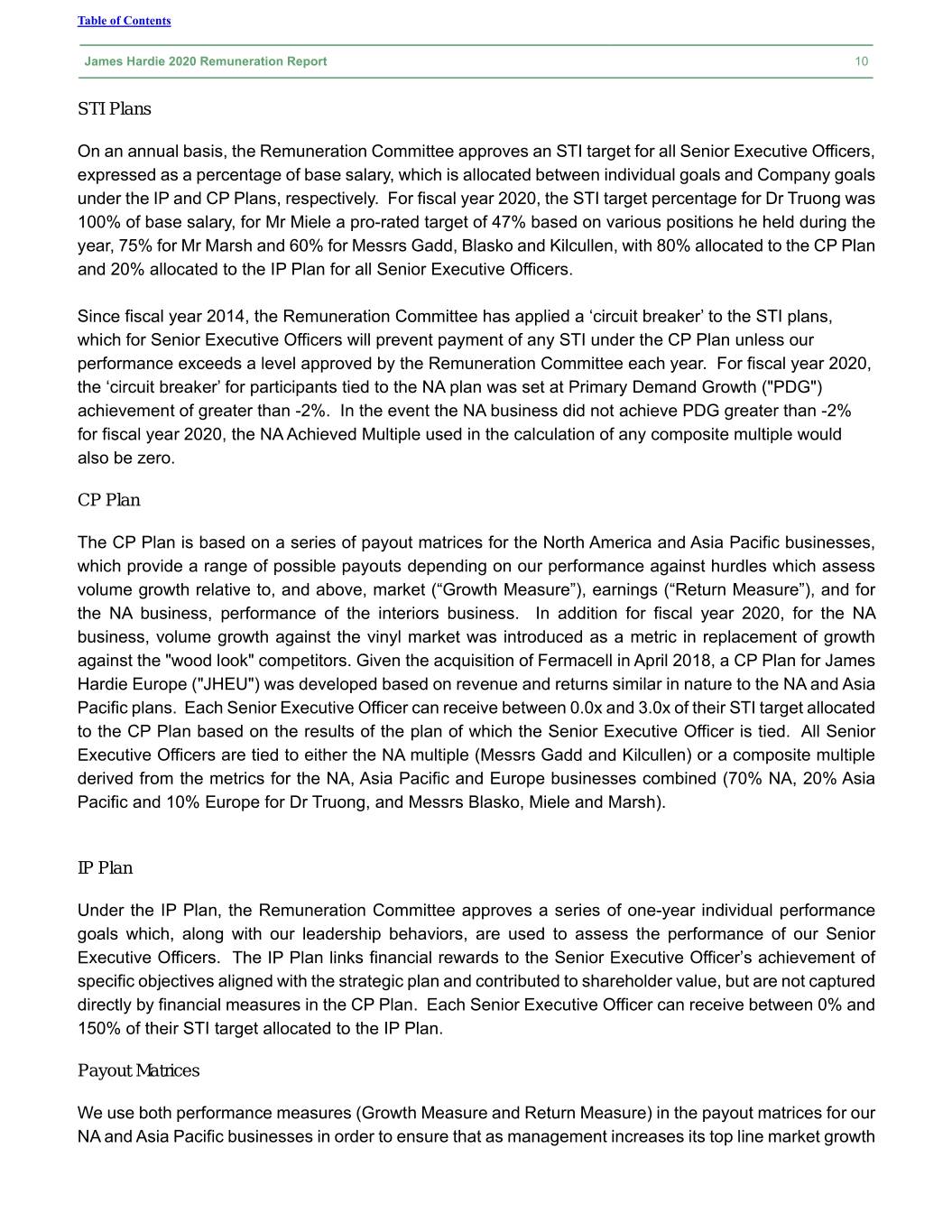 Table of Contents James Hardie 2020 Remuneration Report 10 STI Plans On an annual basis, the Remuneration Committee approves an STI target for all Senior Executive Officers, expressed as a percentage of base salary, which is allocated between individual goals and Company goals under the IP and CP Plans, respectively. For fiscal year 2020, the STI target percentage for Dr Truong was 100% of base salary, for Mr Miele a pro-rated target of 47% based on various positions he held during the year, 75% for Mr Marsh and 60% for Messrs Gadd, Blasko and Kilcullen, with 80% allocated to the CP Plan and 20% allocated to the IP Plan for all Senior Executive Officers. Since fiscal year 2014, the Remuneration Committee has applied a ‘circuit breaker’ to the STI plans, which for Senior Executive Officers will prevent payment of any STI under the CP Plan unless our performance exceeds a level approved by the Remuneration Committee each year. For fiscal year 2020, the ‘circuit breaker’ for participants tied to the NA plan was set at Primary Demand Growth ("PDG") achievement of greater than -2%. In the event the NA business did not achieve PDG greater than -2% for fiscal year 2020, the NA Achieved Multiple used in the calculation of any composite multiple would also be zero. CP Plan The CP Plan is based on a series of payout matrices for the North America and Asia Pacific businesses, which provide a range of possible payouts depending on our performance against hurdles which assess volume growth relative to, and above, market (“Growth Measure”), earnings (“Return Measure”), and for the NA business, performance of the interiors business. In addition for fiscal year 2020, for the NA business, volume growth against the vinyl market was introduced as a metric in replacement of growth against the "wood look" competitors. Given the acquisition of Fermacell in April 2018, a CP Plan for James Hardie Europe ("JHEU") was developed based on revenue and returns similar in nature to the NA and Asia Pacific plans. Each Senior Executive Officer can receive between 0.0x and 3.0x of their STI target allocated to the CP Plan based on the results of the plan of which the Senior Executive Officer is tied. All Senior Executive Officers are tied to either the NA multiple (Messrs Gadd and Kilcullen) or a composite multiple derived from the metrics for the NA, Asia Pacific and Europe businesses combined (70% NA, 20% Asia Pacific and 10% Europe for Dr Truong, and Messrs Blasko, Miele and Marsh). IP Plan Under the IP Plan, the Remuneration Committee approves a series of one-year individual performance goals which, along with our leadership behaviors, are used to assess the performance of our Senior Executive Officers. The IP Plan links financial rewards to the Senior Executive Officer’s achievement of specific objectives aligned with the strategic plan and contributed to shareholder value, but are not captured directly by financial measures in the CP Plan. Each Senior Executive Officer can receive between 0% and 150% of their STI target allocated to the IP Plan. Payout Matrices We use both performance measures (Growth Measure and Return Measure) in the payout matrices for our NA and Asia Pacific businesses in order to ensure that as management increases its top line market growth