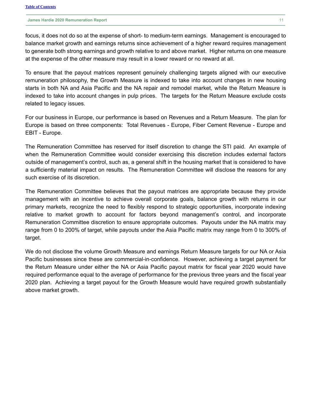 Table of Contents James Hardie 2020 Remuneration Report 11 focus, it does not do so at the expense of short- to medium-term earnings. Management is encouraged to balance market growth and earnings returns since achievement of a higher reward requires management to generate both strong earnings and growth relative to and above market. Higher returns on one measure at the expense of the other measure may result in a lower reward or no reward at all. To ensure that the payout matrices represent genuinely challenging targets aligned with our executive remuneration philosophy, the Growth Measure is indexed to take into account changes in new housing starts in both NA and Asia Pacific and the NA repair and remodel market, while the Return Measure is indexed to take into account changes in pulp prices. The targets for the Return Measure exclude costs related to legacy issues. For our business in Europe, our performance is based on Revenues and a Return Measure. The plan for Europe is based on three components: Total Revenues - Europe, Fiber Cement Revenue - Europe and EBIT - Europe. The Remuneration Committee has reserved for itself discretion to change the STI paid. An example of when the Remuneration Committee would consider exercising this discretion includes external factors outside of management’s control, such as, a general shift in the housing market that is considered to have a sufficiently material impact on results. The Remuneration Committee will disclose the reasons for any such exercise of its discretion. The Remuneration Committee believes that the payout matrices are appropriate because they provide management with an incentive to achieve overall corporate goals, balance growth with returns in our primary markets, recognize the need to flexibly respond to strategic opportunities, incorporate indexing relative to market growth to account for factors beyond management’s control, and incorporate Remuneration Committee discretion to ensure appropriate outcomes. Payouts under the NA matrix may range from 0 to 200% of target, while payouts under the Asia Pacific matrix may range from 0 to 300% of target. We do not disclose the volume Growth Measure and earnings Return Measure targets for our NA or Asia Pacific businesses since these are commercial-in-confidence. However, achieving a target payment for the Return Measure under either the NA or Asia Pacific payout matrix for fiscal year 2020 would have required performance equal to the average of performance for the previous three years and the fiscal year 2020 plan. Achieving a target payout for the Growth Measure would have required growth substantially above market growth.