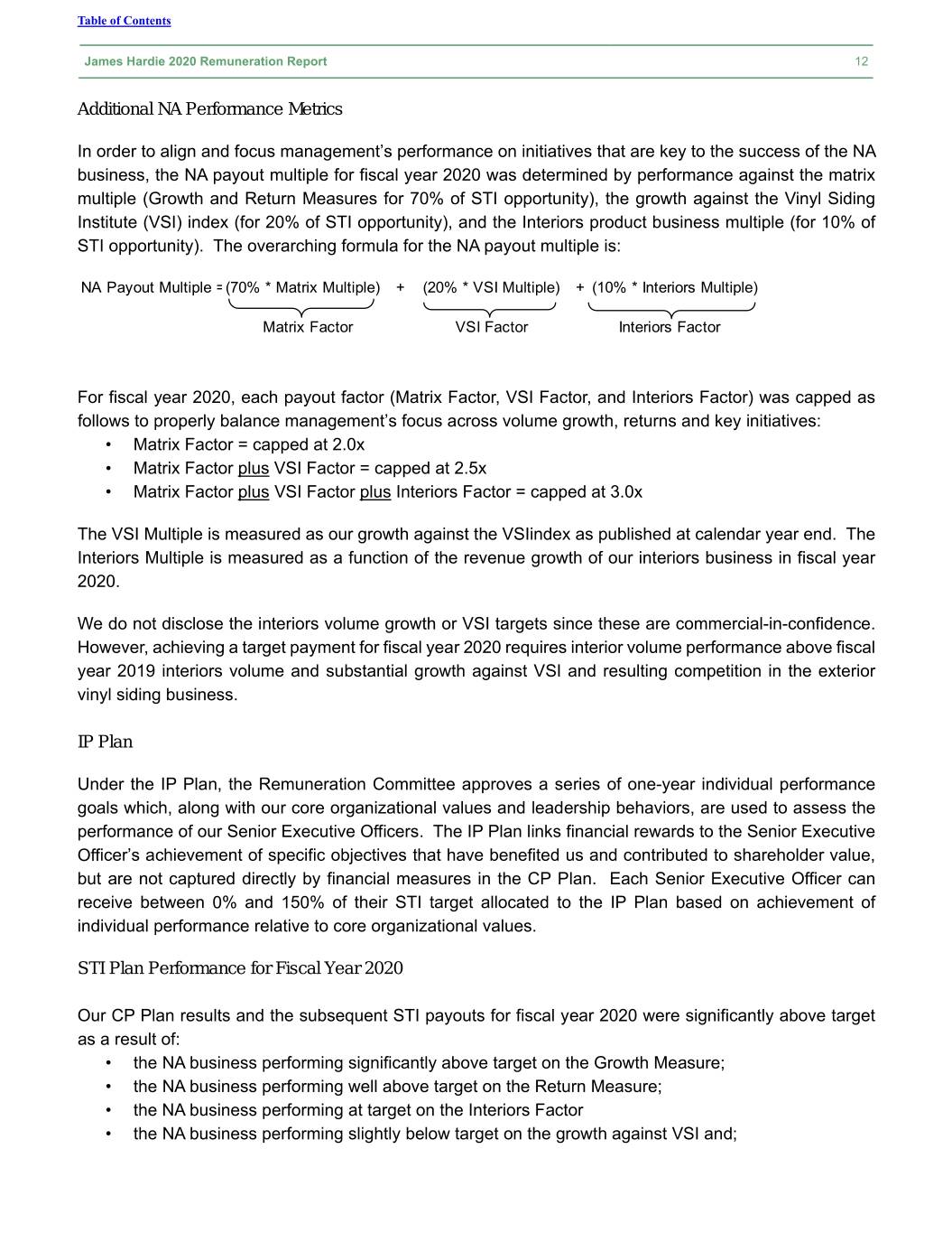 Table of Contents James Hardie 2020 Remuneration Report 12 Additional NA Performance Metrics In order to align and focus management’s performance on initiatives that are key to the success of the NA business, the NA payout multiple for fiscal year 2020 was determined by performance against the matrix multiple (Growth and Return Measures for 70% of STI opportunity), the growth against the Vinyl Siding Institute (VSI) index (for 20% of STI opportunity), and the Interiors product business multiple (for 10% of STI opportunity). The overarching formula for the NA payout multiple is: NA Payout Multiple =(70% * Matrix Multiple) + (20% * VSI Multiple) + (10% * Interiors Multiple) Matrix Factor VSI Factor Interiors Factor For fiscal year 2020, each payout factor (Matrix Factor, VSI Factor, and Interiors Factor) was capped as follows to properly balance management’s focus across volume growth, returns and key initiatives: • Matrix Factor = capped at 2.0x • Matrix Factor plus VSI Factor = capped at 2.5x • Matrix Factor plus VSI Factor plus Interiors Factor = capped at 3.0x The VSI Multiple is measured as our growth against the VSIindex as published at calendar year end. The Interiors Multiple is measured as a function of the revenue growth of our interiors business in fiscal year 2020. We do not disclose the interiors volume growth or VSI targets since these are commercial-in-confidence. However, achieving a target payment for fiscal year 2020 requires interior volume performance above fiscal year 2019 interiors volume and substantial growth against VSI and resulting competition in the exterior vinyl siding business. IP Plan Under the IP Plan, the Remuneration Committee approves a series of one-year individual performance goals which, along with our core organizational values and leadership behaviors, are used to assess the performance of our Senior Executive Officers. The IP Plan links financial rewards to the Senior Executive Officer’s achievement of specific objectives that have benefited us and contributed to shareholder value, but are not captured directly by financial measures in the CP Plan. Each Senior Executive Officer can receive between 0% and 150% of their STI target allocated to the IP Plan based on achievement of individual performance relative to core organizational values. STI Plan Performance for Fiscal Year 2020 Our CP Plan results and the subsequent STI payouts for fiscal year 2020 were significantly above target as a result of: • the NA business performing significantly above target on the Growth Measure; • the NA business performing well above target on the Return Measure; • the NA business performing at target on the Interiors Factor • the NA business performing slightly below target on the growth against VSI and;