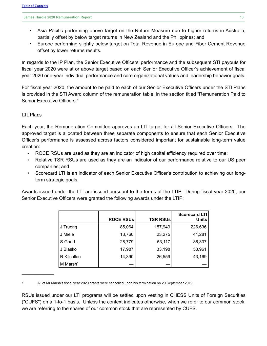 Table of Contents James Hardie 2020 Remuneration Report 13 • Asia Pacific performing above target on the Return Measure due to higher returns in Australia, partially offset by below target returns in New Zealand and the Philippines; and • Europe performing slightly below target on Total Revenue in Europe and Fiber Cement Revenue offset by lower returns results. In regards to the IP Plan, the Senior Executive Officers’ performance and the subsequent STI payouts for fiscal year 2020 were at or above target based on each Senior Executive Officer’s achievement of fiscal year 2020 one-year individual performance and core organizational values and leadership behavior goals. For fiscal year 2020, the amount to be paid to each of our Senior Executive Officers under the STI Plans is provided in the STI Award column of the remuneration table, in the section titled “Remuneration Paid to Senior Executive Officers.” LTI Plans Each year, the Remuneration Committee approves an LTI target for all Senior Executive Officers. The approved target is allocated between three separate components to ensure that each Senior Executive Officer’s performance is assessed across factors considered important for sustainable long-term value creation: • ROCE RSUs are used as they are an indicator of high capital efficiency required over time; • Relative TSR RSUs are used as they are an indicator of our performance relative to our US peer companies; and • Scorecard LTI is an indicator of each Senior Executive Officer’s contribution to achieving our long- term strategic goals. Awards issued under the LTI are issued pursuant to the terms of the LTIP. During fiscal year 2020, our Senior Executive Officers were granted the following awards under the LTIP: Scorecard LTI ROCE RSUs TSR RSUs Units J Truong 85,064 157,949 226,636 J Miele 13,760 23,275 41,281 S Gadd 28,779 53,117 86,337 J Blasko 17,987 33,198 53,961 R Kilcullen 14,390 26,559 43,169 M Marsh1 — — — ____________ 1 All of Mr Marsh's fiscal year 2020 grants were cancelled upon his termination on 20 September 2019. RSUs issued under our LTI programs will be settled upon vesting in CHESS Units of Foreign Securities ("CUFS") on a 1-to-1 basis. Unless the context indicates otherwise, when we refer to our common stock, we are referring to the shares of our common stock that are represented by CUFS.