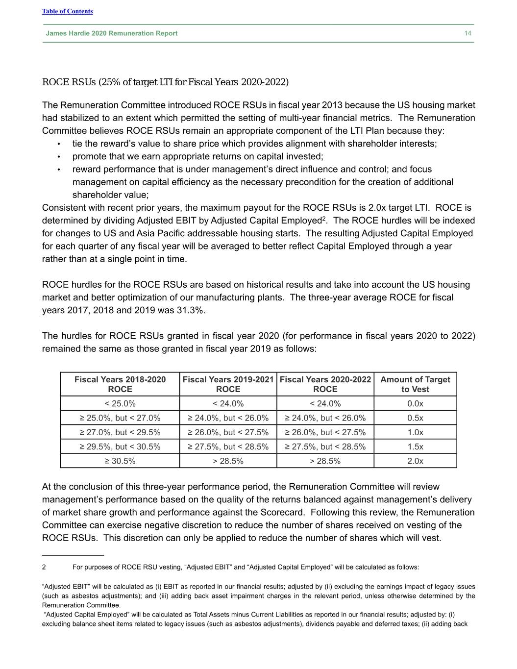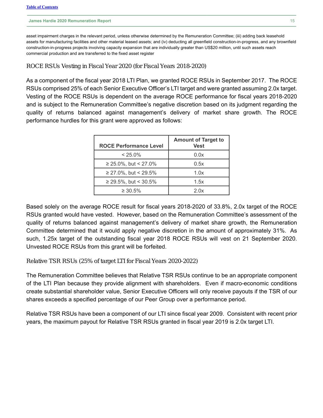 Table of Contents James Hardie 2020 Remuneration Report 15 asset impairment charges in the relevant period, unless otherwise determined by the Remuneration Committee; (iii) adding back leasehold assets for manufacturing facilities and other material leased assets; and (iv) deducting all greenfield construction-in-progress, and any brownfield construction-in-progress projects involving capacity expansion that are individually greater than US$20 million, until such assets reach commercial production and are transferred to the fixed asset register ROCE RSUs Vesting in Fiscal Year 2020 (for Fiscal Years 2018-2020) As a component of the fiscal year 2018 LTI Plan, we granted ROCE RSUs in September 2017. The ROCE RSUs comprised 25% of each Senior Executive Officer’s LTI target and were granted assuming 2.0x target. Vesting of the ROCE RSUs is dependent on the average ROCE performance for fiscal years 2018-2020 and is subject to the Remuneration Committee’s negative discretion based on its judgment regarding the quality of returns balanced against management’s delivery of market share growth. The ROCE performance hurdles for this grant were approved as follows: Amount of Target to ROCE Performance Level Vest < 25.0% 0.0x ≥ 25.0%, but < 27.0% 0.5x ≥ 27.0%, but < 29.5% 1.0x ≥ 29.5%, but < 30.5% 1.5x ≥ 30.5% 2.0x Based solely on the average ROCE result for fiscal years 2018-2020 of 33.8%, 2.0x target of the ROCE RSUs granted would have vested. However, based on the Remuneration Committee’s assessment of the quality of returns balanced against management’s delivery of market share growth, the Remuneration Committee determined that it would apply negative discretion in the amount of approximately 31%. As such, 1.25x target of the outstanding fiscal year 2018 ROCE RSUs will vest on 21 September 2020. Unvested ROCE RSUs from this grant will be forfeited. Relative TSR RSUs (25% of target LTI for Fiscal Years 2020-2022) The Remuneration Committee believes that Relative TSR RSUs continue to be an appropriate component of the LTI Plan because they provide alignment with shareholders. Even if macro-economic conditions create substantial shareholder value, Senior Executive Officers will only receive payouts if the TSR of our shares exceeds a specified percentage of our Peer Group over a performance period. Relative TSR RSUs have been a component of our LTI since fiscal year 2009. Consistent with recent prior years, the maximum payout for Relative TSR RSUs granted in fiscal year 2019 is 2.0x target LTI.