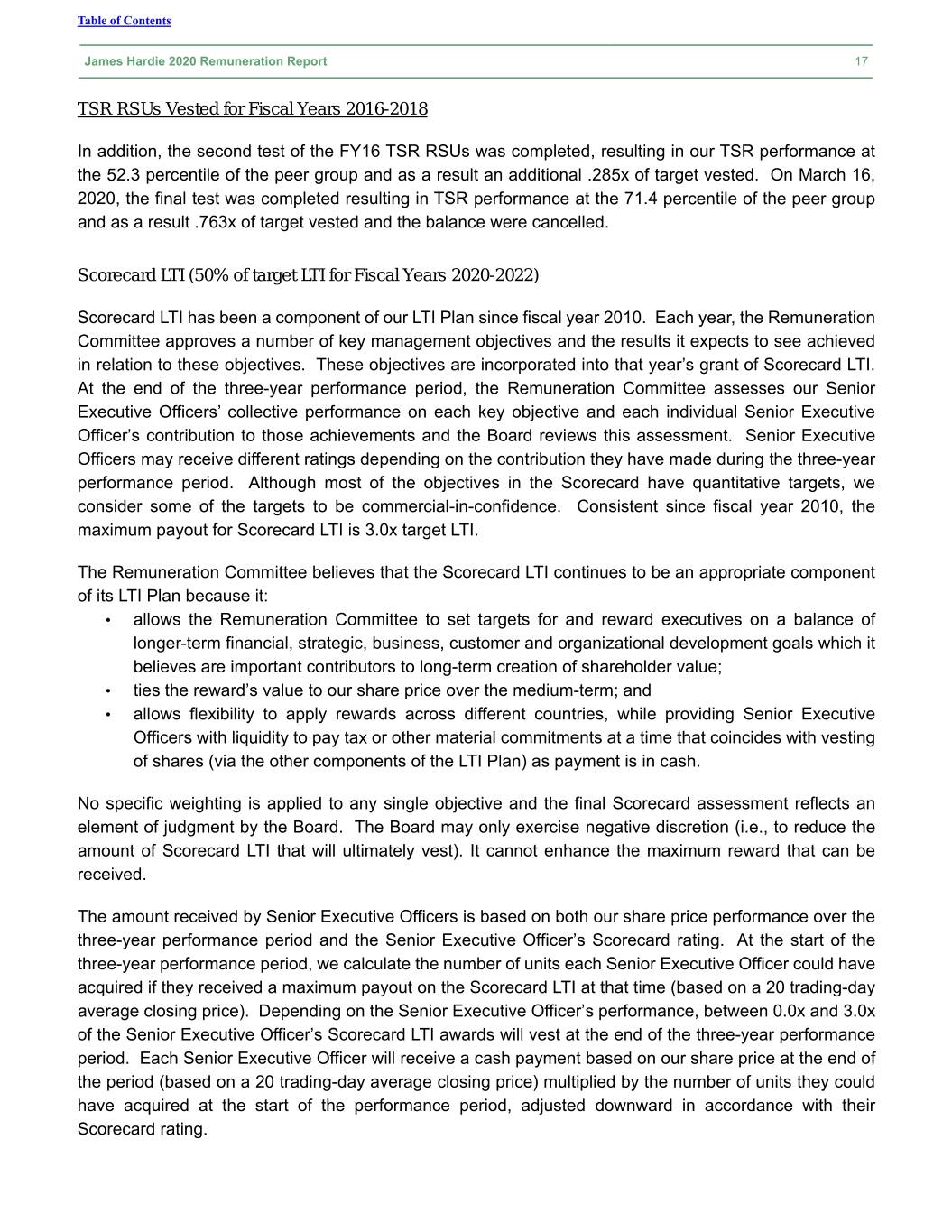 Table of Contents James Hardie 2020 Remuneration Report 17 TSR RSUs Vested for Fiscal Years 2016-2018 In addition, the second test of the FY16 TSR RSUs was completed, resulting in our TSR performance at the 52.3 percentile of the peer group and as a result an additional .285x of target vested. On March 16, 2020, the final test was completed resulting in TSR performance at the 71.4 percentile of the peer group and as a result .763x of target vested and the balance were cancelled. Scorecard LTI (50% of target LTI for Fiscal Years 2020-2022) Scorecard LTI has been a component of our LTI Plan since fiscal year 2010. Each year, the Remuneration Committee approves a number of key management objectives and the results it expects to see achieved in relation to these objectives. These objectives are incorporated into that year’s grant of Scorecard LTI. At the end of the three-year performance period, the Remuneration Committee assesses our Senior Executive Officers’ collective performance on each key objective and each individual Senior Executive Officer’s contribution to those achievements and the Board reviews this assessment. Senior Executive Officers may receive different ratings depending on the contribution they have made during the three-year performance period. Although most of the objectives in the Scorecard have quantitative targets, we consider some of the targets to be commercial-in-confidence. Consistent since fiscal year 2010, the maximum payout for Scorecard LTI is 3.0x target LTI. The Remuneration Committee believes that the Scorecard LTI continues to be an appropriate component of its LTI Plan because it: • allows the Remuneration Committee to set targets for and reward executives on a balance of longer-term financial, strategic, business, customer and organizational development goals which it believes are important contributors to long-term creation of shareholder value; • ties the reward’s value to our share price over the medium-term; and • allows flexibility to apply rewards across different countries, while providing Senior Executive Officers with liquidity to pay tax or other material commitments at a time that coincides with vesting of shares (via the other components of the LTI Plan) as payment is in cash. No specific weighting is applied to any single objective and the final Scorecard assessment reflects an element of judgment by the Board. The Board may only exercise negative discretion (i.e., to reduce the amount of Scorecard LTI that will ultimately vest). It cannot enhance the maximum reward that can be received. The amount received by Senior Executive Officers is based on both our share price performance over the three-year performance period and the Senior Executive Officer’s Scorecard rating. At the start of the three-year performance period, we calculate the number of units each Senior Executive Officer could have acquired if they received a maximum payout on the Scorecard LTI at that time (based on a 20 trading-day average closing price). Depending on the Senior Executive Officer’s performance, between 0.0x and 3.0x of the Senior Executive Officer’s Scorecard LTI awards will vest at the end of the three-year performance period. Each Senior Executive Officer will receive a cash payment based on our share price at the end of the period (based on a 20 trading-day average closing price) multiplied by the number of units they could have acquired at the start of the performance period, adjusted downward in accordance with their Scorecard rating.