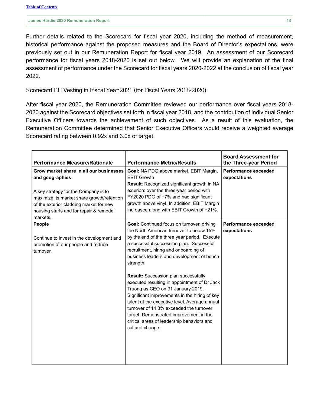 Table of Contents James Hardie 2020 Remuneration Report 18 Further details related to the Scorecard for fiscal year 2020, including the method of measurement, historical performance against the proposed measures and the Board of Director’s expectations, were previously set out in our Remuneration Report for fiscal year 2019. An assessment of our Scorecard performance for fiscal years 2018-2020 is set out below. We will provide an explanation of the final assessment of performance under the Scorecard for fiscal years 2020-2022 at the conclusion of fiscal year 2022. Scorecard LTI Vesting in Fiscal Year 2021 (for Fiscal Years 2018-2020) After fiscal year 2020, the Remuneration Committee reviewed our performance over fiscal years 2018- 2020 against the Scorecard objectives set forth in fiscal year 2018, and the contribution of individual Senior Executive Officers towards the achievement of such objectives. As a result of this evaluation, the Remuneration Committee determined that Senior Executive Officers would receive a weighted average Scorecard rating between 0.92x and 3.0x of target. Board Assessment for Performance Measure/Rationale Performance Metric/Results the Three-year Period Grow market share in all our businesses Goal: NA PDG above market, EBIT Margin, Performance exceeded and geographies EBIT Growth expectations Result: Recognized significant growth in NA A key strategy for the Company is to exteriors over the three-year period with maximize its market share growth/retention FY2020 PDG of +7% and had significant of the exterior cladding market for new growth above vinyl. In addition, EBIT Margin housing starts and for repair & remodel increased along with EBIT Growth of +21%. markets. People Goal: Continued focus on turnover, driving Performance exceeded the North American turnover to below 15% expectations Continue to invest in the development and by the end of the three year period. Execute promotion of our people and reduce a successful succession plan. Successful turnover. recruitment, hiring and onboarding of business leaders and development of bench strength. Result: Succession plan successfully executed resulting in appointment of Dr Jack Truong as CEO on 31 January 2019. Significant improvements in the hiring of key talent at the executive level. Average annual turnover of 14.3% exceeded the turnover target. Demonstrated improvement in the critical areas of leadership behaviors and cultural change.
