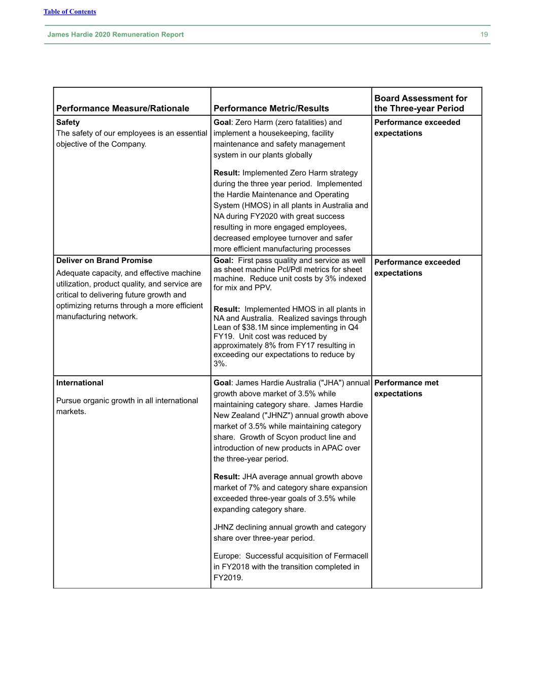 Table of Contents James Hardie 2020 Remuneration Report 19 Board Assessment for Performance Measure/Rationale Performance Metric/Results the Three-year Period Safety Goal: Zero Harm (zero fatalities) and Performance exceeded The safety of our employees is an essential implement a housekeeping, facility expectations objective of the Company. maintenance and safety management system in our plants globally Result: Implemented Zero Harm strategy during the three year period. Implemented the Hardie Maintenance and Operating System (HMOS) in all plants in Australia and NA during FY2020 with great success resulting in more engaged employees, decreased employee turnover and safer more efficient manufacturing processes Deliver on Brand Promise Goal: First pass quality and service as well Performance exceeded Adequate capacity, and effective machine as sheet machine Pcl/Pdl metrics for sheet expectations machine. Reduce unit costs by 3% indexed utilization, product quality, and service are for mix and PPV. critical to delivering future growth and optimizing returns through a more efficient Result: Implemented HMOS in all plants in manufacturing network. NA and Australia. Realized savings through Lean of $38.1M since implementing in Q4 FY19. Unit cost was reduced by approximately 8% from FY17 resulting in exceeding our expectations to reduce by 3%. International Goal: James Hardie Australia ("JHA") annual Performance met growth above market of 3.5% while expectations Pursue organic growth in all international maintaining category share. James Hardie markets. New Zealand ("JHNZ") annual growth above market of 3.5% while maintaining category share. Growth of Scyon product line and introduction of new products in APAC over the three-year period. Result: JHA average annual growth above market of 7% and category share expansion exceeded three-year goals of 3.5% while expanding category share. JHNZ declining annual growth and category share over three-year period. Europe: Successful acquisition of Fermacell in FY2018 with the transition completed in FY2019.