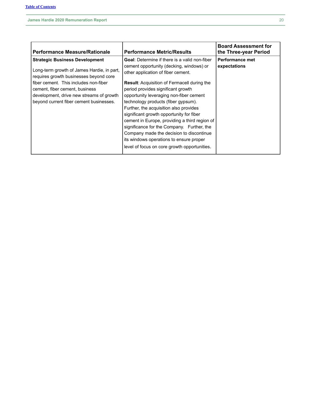 Table of Contents James Hardie 2020 Remuneration Report 20 Board Assessment for Performance Measure/Rationale Performance Metric/Results the Three-year Period Strategic Business Development Goal: Determine if there is a valid non-fiber Performance met cement opportunity (decking, windows) or expectations Long-term growth of James Hardie, in part, other application of fiber cement. requires growth businesses beyond core fiber cement. This includes non-fiber Result: Acquisition of Fermacell during the cement, fiber cement, business period provides significant growth development, drive new streams of growth opportunity leveraging non-fiber cement beyond current fiber cement businesses. technology products (fiber gypsum). Further, the acquisition also provides significant growth opportunity for fiber cement in Europe, providing a third region of significance for the Company. Further, the Company made the decision to discontinue its windows operations to ensure proper level of focus on core growth opportunities.