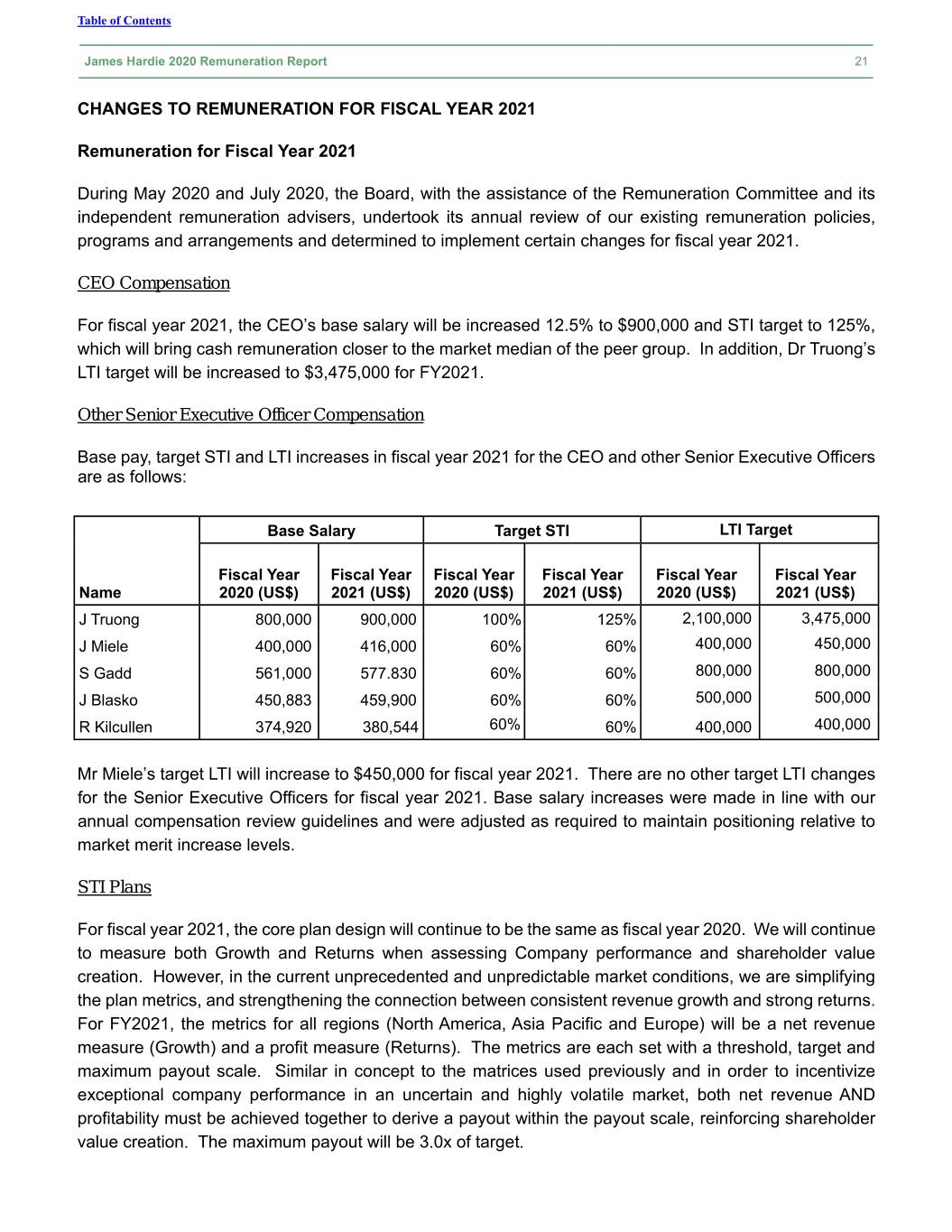 Table of Contents James Hardie 2020 Remuneration Report 21 CHANGES TO REMUNERATION FOR FISCAL YEAR 2021 Remuneration for Fiscal Year 2021 During May 2020 and July 2020, the Board, with the assistance of the Remuneration Committee and its independent remuneration advisers, undertook its annual review of our existing remuneration policies, programs and arrangements and determined to implement certain changes for fiscal year 2021. CEO Compensation For fiscal year 2021, the CEO’s base salary will be increased 12.5% to $900,000 and STI target to 125%, which will bring cash remuneration closer to the market median of the peer group. In addition, Dr Truong’s LTI target will be increased to $3,475,000 for FY2021. Other Senior Executive Officer Compensation Base pay, target STI and LTI increases in fiscal year 2021 for the CEO and other Senior Executive Officers are as follows: Base Salary Target STI LTI Target Fiscal Year Fiscal Year Fiscal Year Fiscal Year Fiscal Year Fiscal Year Name 2020 (US$) 2021 (US$) 2020 (US$) 2021 (US$) 2020 (US$) 2021 (US$) J Truong 800,000 900,000 100% 125% 2,100,000 3,475,000 J Miele 400,000 416,000 60% 60% 400,000 450,000 S Gadd 561,000 577.830 60% 60% 800,000 800,000 J Blasko 450,883 459,900 60% 60% 500,000 500,000 R Kilcullen 374,920 380,544 60% 60% 400,000 400,000 Mr Miele’s target LTI will increase to $450,000 for fiscal year 2021. There are no other target LTI changes for the Senior Executive Officers for fiscal year 2021. Base salary increases were made in line with our annual compensation review guidelines and were adjusted as required to maintain positioning relative to market merit increase levels. STI Plans For fiscal year 2021, the core plan design will continue to be the same as fiscal year 2020. We will continue to measure both Growth and Returns when assessing Company performance and shareholder value creation. However, in the current unprecedented and unpredictable market conditions, we are simplifying the plan metrics, and strengthening the connection between consistent revenue growth and strong returns. For FY2021, the metrics for all regions (North America, Asia Pacific and Europe) will be a net revenue measure (Growth) and a profit measure (Returns). The metrics are each set with a threshold, target and maximum payout scale. Similar in concept to the matrices used previously and in order to incentivize exceptional company performance in an uncertain and highly volatile market, both net revenue AND profitability must be achieved together to derive a payout within the payout scale, reinforcing shareholder value creation. The maximum payout will be 3.0x of target.