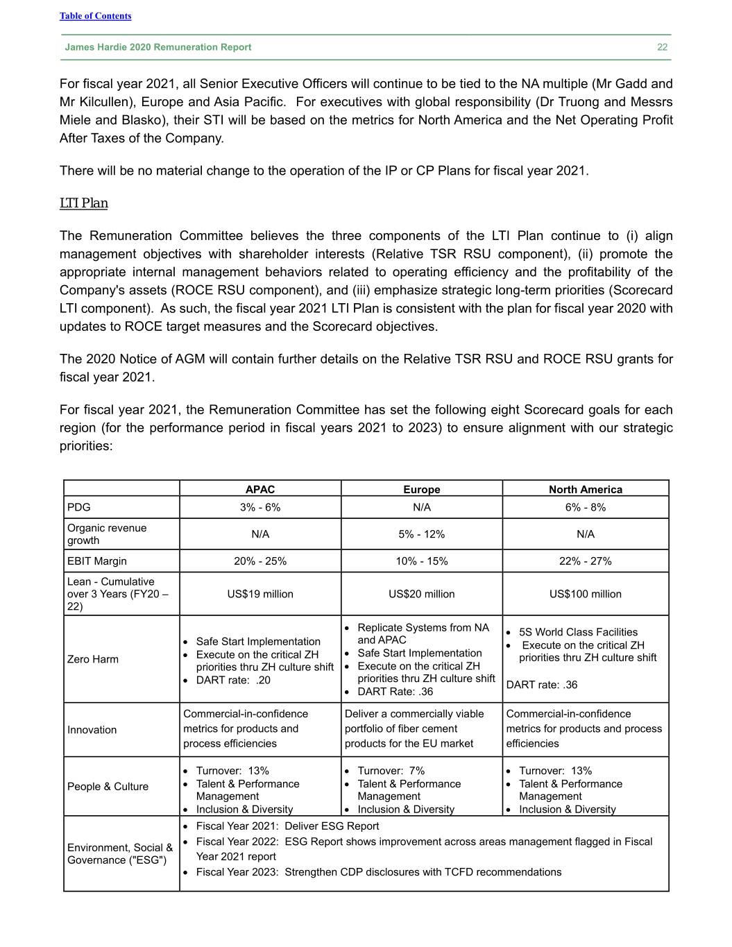 Table of Contents James Hardie 2020 Remuneration Report 22 For fiscal year 2021, all Senior Executive Officers will continue to be tied to the NA multiple (Mr Gadd and Mr Kilcullen), Europe and Asia Pacific. For executives with global responsibility (Dr Truong and Messrs Miele and Blasko), their STI will be based on the metrics for North America and the Net Operating Profit After Taxes of the Company. There will be no material change to the operation of the IP or CP Plans for fiscal year 2021. LTI Plan The Remuneration Committee believes the three components of the LTI Plan continue to (i) align management objectives with shareholder interests (Relative TSR RSU component), (ii) promote the appropriate internal management behaviors related to operating efficiency and the profitability of the Company's assets (ROCE RSU component), and (iii) emphasize strategic long-term priorities (Scorecard LTI component). As such, the fiscal year 2021 LTI Plan is consistent with the plan for fiscal year 2020 with updates to ROCE target measures and the Scorecard objectives. The 2020 Notice of AGM will contain further details on the Relative TSR RSU and ROCE RSU grants for fiscal year 2021. For fiscal year 2021, the Remuneration Committee has set the following eight Scorecard goals for each region (for the performance period in fiscal years 2021 to 2023) to ensure alignment with our strategic priorities: APAC Europe North America PDG 3% - 6% N/A 6% - 8% Organic revenue N/A 5% - 12% N/A growth EBIT Margin 20% - 25% 10% - 15% 22% - 27% Lean - Cumulative over 3 Years (FY20 – US$19 million US$20 million US$100 million 22) Replicate Systems from NA 5S World Class Facilities Safe Start Implementation and APAC Execute on the critical ZH Safe Start Implementation Zero Harm Execute on the critical ZH priorities thru ZH culture shift Execute on the critical ZH priorities thru ZH culture shift priorities thru ZH culture shift DART rate: .20 DART rate: .36 DART Rate: .36 Commercial-in-confidence Deliver a commercially viable Commercial-in-confidence Innovation metrics for products and portfolio of fiber cement metrics for products and process process efficiencies products for the EU market efficiencies Turnover: 13% Turnover: 7% Turnover: 13% People & Culture Talent & Performance Talent & Performance Talent & Performance Management Management Management Inclusion & Diversity Inclusion & Diversity Inclusion & Diversity Fiscal Year 2021: Deliver ESG Report Fiscal Year 2022: ESG Report shows improvement across areas management flagged in Fiscal Environment, Social & Governance ("ESG") Year 2021 report Fiscal Year 2023: Strengthen CDP disclosures with TCFD recommendations