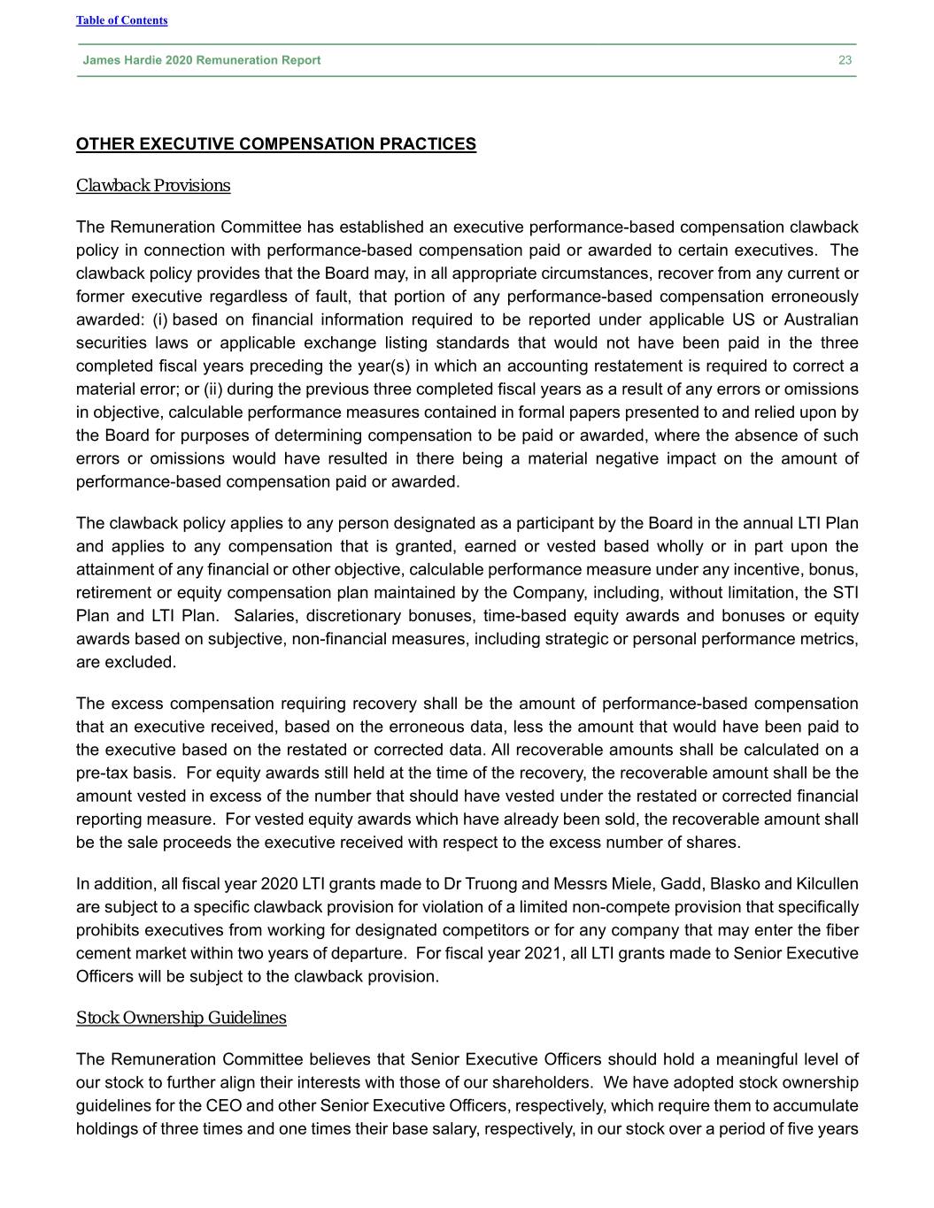 Table of Contents James Hardie 2020 Remuneration Report 23 OTHER EXECUTIVE COMPENSATION PRACTICES Clawback Provisions The Remuneration Committee has established an executive performance-based compensation clawback policy in connection with performance-based compensation paid or awarded to certain executives. The clawback policy provides that the Board may, in all appropriate circumstances, recover from any current or former executive regardless of fault, that portion of any performance-based compensation erroneously awarded: (i) based on financial information required to be reported under applicable US or Australian securities laws or applicable exchange listing standards that would not have been paid in the three completed fiscal years preceding the year(s) in which an accounting restatement is required to correct a material error; or (ii) during the previous three completed fiscal years as a result of any errors or omissions in objective, calculable performance measures contained in formal papers presented to and relied upon by the Board for purposes of determining compensation to be paid or awarded, where the absence of such errors or omissions would have resulted in there being a material negative impact on the amount of performance-based compensation paid or awarded. The clawback policy applies to any person designated as a participant by the Board in the annual LTI Plan and applies to any compensation that is granted, earned or vested based wholly or in part upon the attainment of any financial or other objective, calculable performance measure under any incentive, bonus, retirement or equity compensation plan maintained by the Company, including, without limitation, the STI Plan and LTI Plan. Salaries, discretionary bonuses, time-based equity awards and bonuses or equity awards based on subjective, non-financial measures, including strategic or personal performance metrics, are excluded. The excess compensation requiring recovery shall be the amount of performance-based compensation that an executive received, based on the erroneous data, less the amount that would have been paid to the executive based on the restated or corrected data. All recoverable amounts shall be calculated on a pre-tax basis. For equity awards still held at the time of the recovery, the recoverable amount shall be the amount vested in excess of the number that should have vested under the restated or corrected financial reporting measure. For vested equity awards which have already been sold, the recoverable amount shall be the sale proceeds the executive received with respect to the excess number of shares. In addition, all fiscal year 2020 LTI grants made to Dr Truong and Messrs Miele, Gadd, Blasko and Kilcullen are subject to a specific clawback provision for violation of a limited non-compete provision that specifically prohibits executives from working for designated competitors or for any company that may enter the fiber cement market within two years of departure. For fiscal year 2021, all LTI grants made to Senior Executive Officers will be subject to the clawback provision. Stock Ownership Guidelines The Remuneration Committee believes that Senior Executive Officers should hold a meaningful level of our stock to further align their interests with those of our shareholders. We have adopted stock ownership guidelines for the CEO and other Senior Executive Officers, respectively, which require them to accumulate holdings of three times and one times their base salary, respectively, in our stock over a period of five years