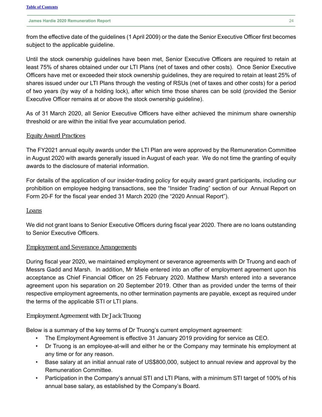 Table of Contents James Hardie 2020 Remuneration Report 24 from the effective date of the guidelines (1 April 2009) or the date the Senior Executive Officer first becomes subject to the applicable guideline. Until the stock ownership guidelines have been met, Senior Executive Officers are required to retain at least 75% of shares obtained under our LTI Plans (net of taxes and other costs). Once Senior Executive Officers have met or exceeded their stock ownership guidelines, they are required to retain at least 25% of shares issued under our LTI Plans through the vesting of RSUs (net of taxes and other costs) for a period of two years (by way of a holding lock), after which time those shares can be sold (provided the Senior Executive Officer remains at or above the stock ownership guideline). As of 31 March 2020, all Senior Executive Officers have either achieved the minimum share ownership threshold or are within the initial five year accumulation period. Equity Award Practices The FY2021 annual equity awards under the LTI Plan are were approved by the Remuneration Committee in August 2020 with awards generally issued in August of each year. We do not time the granting of equity awards to the disclosure of material information. For details of the application of our insider-trading policy for equity award grant participants, including our prohibition on employee hedging transactions, see the “Insider Trading” section of our Annual Report on Form 20-F for the fiscal year ended 31 March 2020 (the “2020 Annual Report”). Loans We did not grant loans to Senior Executive Officers during fiscal year 2020. There are no loans outstanding to Senior Executive Officers. Employment and Severance Arrangements During fiscal year 2020, we maintained employment or severance agreements with Dr Truong and each of Messrs Gadd and Marsh. In addition, Mr Miele entered into an offer of employment agreement upon his acceptance as Chief Financial Officer on 25 February 2020. Matthew Marsh entered into a severance agreement upon his separation on 20 September 2019. Other than as provided under the terms of their respective employment agreements, no other termination payments are payable, except as required under the terms of the applicable STI or LTI plans. Employment Agreement with Dr Jack Truong Below is a summary of the key terms of Dr Truong’s current employment agreement: • The Employment Agreement is effective 31 January 2019 providing for service as CEO. • Dr Truong is an employee-at-will and either he or the Company may terminate his employment at any time or for any reason. • Base salary at an initial annual rate of US$800,000, subject to annual review and approval by the Remuneration Committee. • Participation in the Company’s annual STI and LTI Plans, with a minimum STI target of 100% of his annual base salary, as established by the Company’s Board.