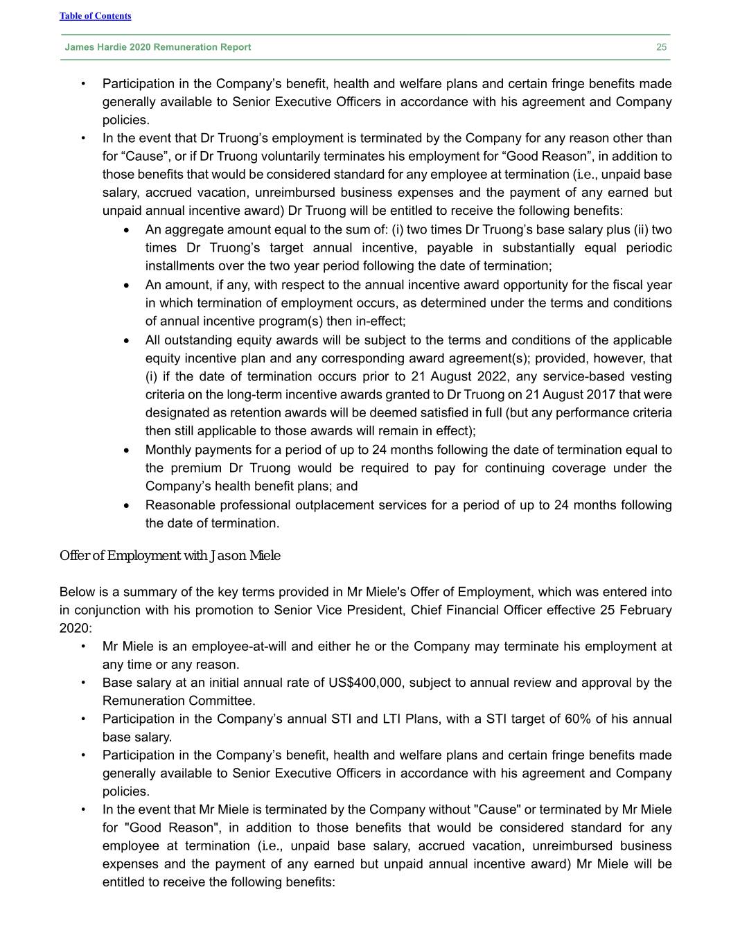 Table of Contents James Hardie 2020 Remuneration Report 25 • Participation in the Company’s benefit, health and welfare plans and certain fringe benefits made generally available to Senior Executive Officers in accordance with his agreement and Company policies. • In the event that Dr Truong’s employment is terminated by the Company for any reason other than for “Cause”, or if Dr Truong voluntarily terminates his employment for “Good Reason”, in addition to those benefits that would be considered standard for any employee at termination (i.e., unpaid base salary, accrued vacation, unreimbursed business expenses and the payment of any earned but unpaid annual incentive award) Dr Truong will be entitled to receive the following benefits: An aggregate amount equal to the sum of: (i) two times Dr Truong’s base salary plus (ii) two times Dr Truong’s target annual incentive, payable in substantially equal periodic installments over the two year period following the date of termination; An amount, if any, with respect to the annual incentive award opportunity for the fiscal year in which termination of employment occurs, as determined under the terms and conditions of annual incentive program(s) then in-effect; All outstanding equity awards will be subject to the terms and conditions of the applicable equity incentive plan and any corresponding award agreement(s); provided, however, that (i) if the date of termination occurs prior to 21 August 2022, any service-based vesting criteria on the long-term incentive awards granted to Dr Truong on 21 August 2017 that were designated as retention awards will be deemed satisfied in full (but any performance criteria then still applicable to those awards will remain in effect); Monthly payments for a period of up to 24 months following the date of termination equal to the premium Dr Truong would be required to pay for continuing coverage under the Company’s health benefit plans; and Reasonable professional outplacement services for a period of up to 24 months following the date of termination. Offer of Employment with Jason Miele Below is a summary of the key terms provided in Mr Miele's Offer of Employment, which was entered into in conjunction with his promotion to Senior Vice President, Chief Financial Officer effective 25 February 2020: • Mr Miele is an employee-at-will and either he or the Company may terminate his employment at any time or any reason. • Base salary at an initial annual rate of US$400,000, subject to annual review and approval by the Remuneration Committee. • Participation in the Company’s annual STI and LTI Plans, with a STI target of 60% of his annual base salary. • Participation in the Company’s benefit, health and welfare plans and certain fringe benefits made generally available to Senior Executive Officers in accordance with his agreement and Company policies. • In the event that Mr Miele is terminated by the Company without "Cause" or terminated by Mr Miele for "Good Reason", in addition to those benefits that would be considered standard for any employee at termination (i.e., unpaid base salary, accrued vacation, unreimbursed business expenses and the payment of any earned but unpaid annual incentive award) Mr Miele will be entitled to receive the following benefits: