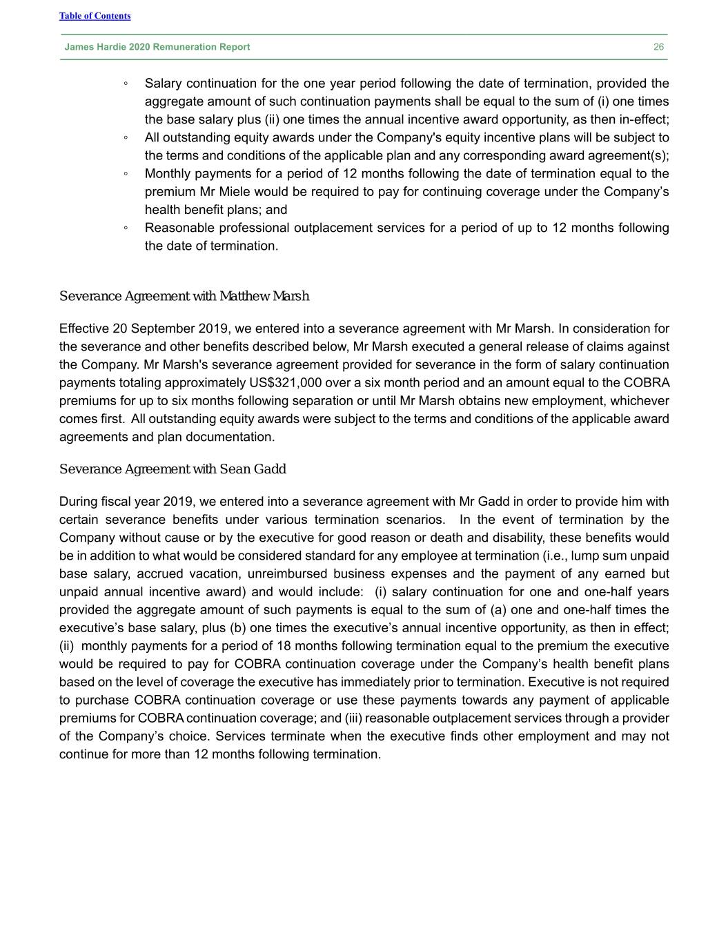 Table of Contents James Hardie 2020 Remuneration Report 26 ◦ Salary continuation for the one year period following the date of termination, provided the aggregate amount of such continuation payments shall be equal to the sum of (i) one times the base salary plus (ii) one times the annual incentive award opportunity, as then in-effect; ◦ All outstanding equity awards under the Company's equity incentive plans will be subject to the terms and conditions of the applicable plan and any corresponding award agreement(s); ◦ Monthly payments for a period of 12 months following the date of termination equal to the premium Mr Miele would be required to pay for continuing coverage under the Company’s health benefit plans; and ◦ Reasonable professional outplacement services for a period of up to 12 months following the date of termination. Severance Agreement with Matthew Marsh Effective 20 September 2019, we entered into a severance agreement with Mr Marsh. In consideration for the severance and other benefits described below, Mr Marsh executed a general release of claims against the Company. Mr Marsh's severance agreement provided for severance in the form of salary continuation payments totaling approximately US$321,000 over a six month period and an amount equal to the COBRA premiums for up to six months following separation or until Mr Marsh obtains new employment, whichever comes first. All outstanding equity awards were subject to the terms and conditions of the applicable award agreements and plan documentation. Severance Agreement with Sean Gadd During fiscal year 2019, we entered into a severance agreement with Mr Gadd in order to provide him with certain severance benefits under various termination scenarios. In the event of termination by the Company without cause or by the executive for good reason or death and disability, these benefits would be in addition to what would be considered standard for any employee at termination (i.e., lump sum unpaid base salary, accrued vacation, unreimbursed business expenses and the payment of any earned but unpaid annual incentive award) and would include: (i) salary continuation for one and one-half years provided the aggregate amount of such payments is equal to the sum of (a) one and one-half times the executive’s base salary, plus (b) one times the executive’s annual incentive opportunity, as then in effect; (ii) monthly payments for a period of 18 months following termination equal to the premium the executive would be required to pay for COBRA continuation coverage under the Company’s health benefit plans based on the level of coverage the executive has immediately prior to termination. Executive is not required to purchase COBRA continuation coverage or use these payments towards any payment of applicable premiums for COBRA continuation coverage; and (iii) reasonable outplacement services through a provider of the Company’s choice. Services terminate when the executive finds other employment and may not continue for more than 12 months following termination.