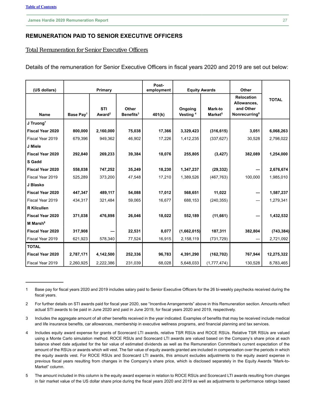 Table of Contents James Hardie 2020 Remuneration Report 27 REMUNERATION PAID TO SENIOR EXECUTIVE OFFICERS Total Remuneration for Senior Executive Officers Details of the remuneration for Senior Executive Officers in fiscal years 2020 and 2019 are set out below: Post- (US dollars) Primary employment Equity Awards Other Relocation TOTAL Allowances, STI Other Ongoing Mark-to and Other Name Base Pay1 Award2 Benefits3 401(k) Vesting 4 Market5 Nonrecurring6 J Truong7 Fiscal Year 2020 800,000 2,160,000 75,038 17,366 3,329,423 (316,615 ) 3,051 6,068,263 Fiscal Year 2019 679,396 949,362 46,902 17,226 1,412,235 (337,627 ) 30,528 2,798,022 J Miele Fiscal Year 2020 292,840 269,233 39,384 18,076 255,805 (3,427 ) 382,089 1,254,000 S Gadd Fiscal Year 2020 558,038 747,252 35,249 18,230 1,347,237 (29,332 ) — 2,676,674 Fiscal Year 2019 525,289 373,200 47,548 17,210 1,389,526 (467,763 ) 100,000 1,985,010 J Blasko Fiscal Year 2020 447,347 489,117 54,088 17,012 568,651 11,022 — 1,587,237 Fiscal Year 2019 434,317 321,484 59,065 16,677 688,153 (240,355 ) — 1,279,341 R Kilcullen Fiscal Year 2020 371,038 476,898 26,046 18,022 552,189 (11,661 ) — 1,432,532 M Marsh8 Fiscal Year 2020 317,908 — 22,531 8,077 (1,662,015) 187,311 382,804 (743,384 ) Fiscal Year 2019 621,923 578,340 77,524 16,915 2,158,119 (731,729 ) — 2,721,092 TOTAL Fiscal Year 2020 2,787,171 4,142,500 252,336 96,783 4,391,290 (162,702 ) 767,944 12,275,322 Fiscal Year 2019 2,260,925 2,222,386 231,039 68,028 5,648,033 (1,777,474 ) 130,528 8,783,465 ____________ 1 Base pay for fiscal years 2020 and 2019 includes salary paid to Senior Executive Officers for the 26 bi-weekly paychecks received during the fiscal years. 2 For further details on STI awards paid for fiscal year 2020, see “Incentive Arrangements” above in this Remuneration section. Amounts reflect actual STI awards to be paid in June 2020 and paid in June 2019, for fiscal years 2020 and 2019, respectively. 3 Includes the aggregate amount of all other benefits received in the year indicated. Examples of benefits that may be received include medical and life insurance benefits, car allowances, membership in executive wellness programs, and financial planning and tax services. 4 Includes equity award expense for grants of Scorecard LTI awards, relative TSR RSUs and ROCE RSUs. Relative TSR RSUs are valued using a Monte Carlo simulation method. ROCE RSUs and Scorecard LTI awards are valued based on the Company’s share price at each balance sheet date adjusted for the fair value of estimated dividends as well as the Remuneration Committee’s current expectation of the amount of the RSUs or awards which will vest. The fair value of equity awards granted are included in compensation over the periods in which the equity awards vest. For ROCE RSUs and Scorecard LTI awards, this amount excludes adjustments to the equity award expense in previous fiscal years resulting from changes in the Company’s share price, which is disclosed separately in the Equity Awards “Mark-to- Market” column. 5 The amount included in this column is the equity award expense in relation to ROCE RSUs and Scorecard LTI awards resulting from changes in fair market value of the US dollar share price during the fiscal years 2020 and 2019 as well as adjustments to performance ratings based