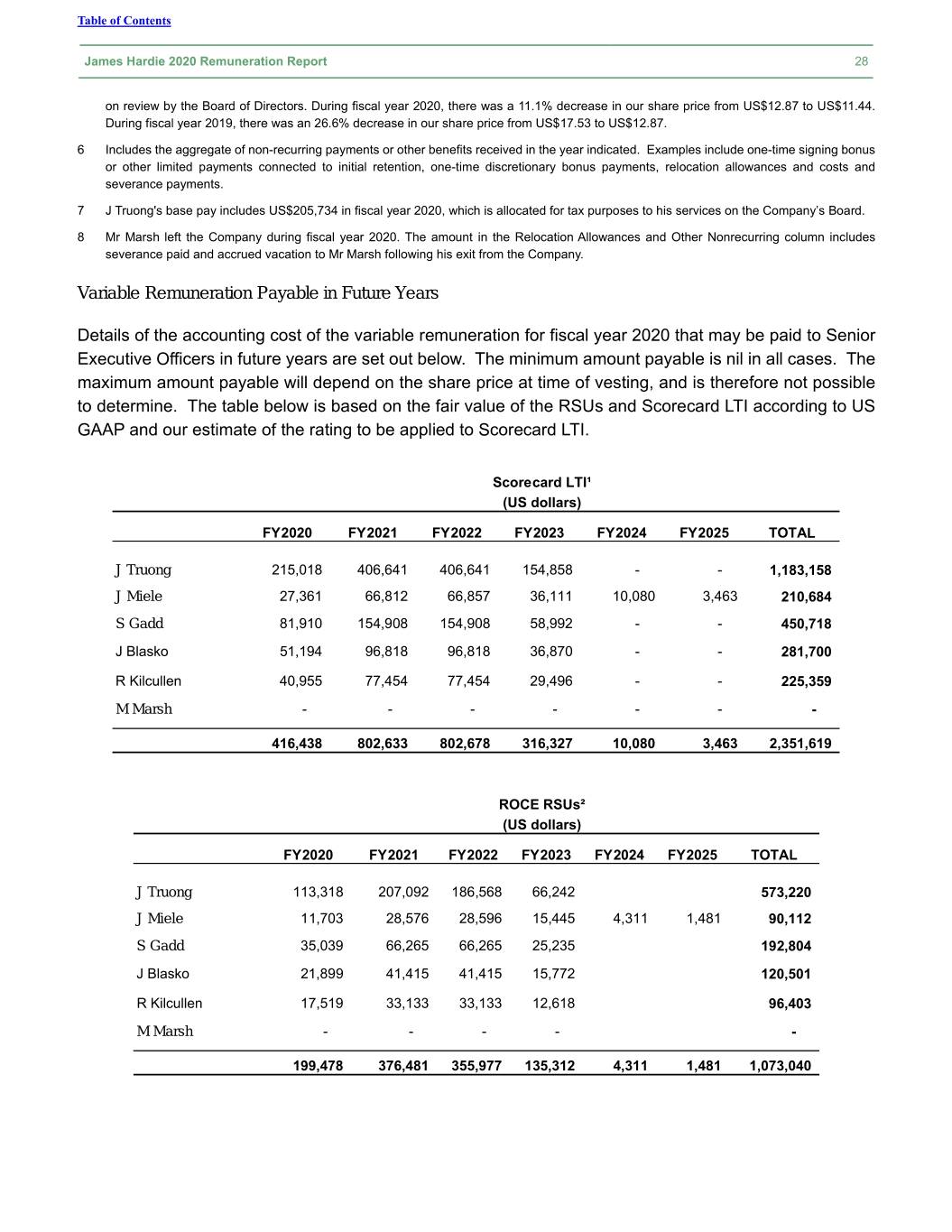 Table of Contents James Hardie 2020 Remuneration Report 28 on review by the Board of Directors. During fiscal year 2020, there was a 11.1% decrease in our share price from US$12.87 to US$11.44. During fiscal year 2019, there was an 26.6% decrease in our share price from US$17.53 to US$12.87. 6 Includes the aggregate of non-recurring payments or other benefits received in the year indicated. Examples include one-time signing bonus or other limited payments connected to initial retention, one-time discretionary bonus payments, relocation allowances and costs and severance payments. 7 J Truong's base pay includes US$205,734 in fiscal year 2020, which is allocated for tax purposes to his services on the Company’s Board. 8 Mr Marsh left the Company during fiscal year 2020. The amount in the Relocation Allowances and Other Nonrecurring column includes severance paid and accrued vacation to Mr Marsh following his exit from the Company. Variable Remuneration Payable in Future Years Details of the accounting cost of the variable remuneration for fiscal year 2020 that may be paid to Senior Executive Officers in future years are set out below. The minimum amount payable is nil in all cases. The maximum amount payable will depend on the share price at time of vesting, and is therefore not possible to determine. The table below is based on the fair value of the RSUs and Scorecard LTI according to US GAAP and our estimate of the rating to be applied to Scorecard LTI. Scorecard LTI¹ (US dollars) FY2020 FY2021 FY2022 FY2023 FY2024 FY2025 TOTAL J Truong 215,018 406,641 406,641 154,858 - - 1,183,158 J Miele 27,361 66,812 66,857 36,111 10,080 3,463 210,684 S Gadd 81,910 154,908 154,908 58,992 - - 450,718 J Blasko 51,194 96,818 96,818 36,870 - - 281,700 R Kilcullen 40,955 77,454 77,454 29,496 - - 225,359 M Marsh - - - - - - - 416,438 802,633 802,678 316,327 10,080 3,463 2,351,619 ROCE RSUs² (US dollars) FY2020 FY2021 FY2022 FY2023 FY2024 FY2025 TOTAL J Truong 113,318 207,092 186,568 66,242 573,220 J Miele 11,703 28,576 28,596 15,445 4,311 1,481 90,112 S Gadd 35,039 66,265 66,265 25,235 192,804 J Blasko 21,899 41,415 41,415 15,772 120,501 R Kilcullen 17,519 33,133 33,133 12,618 96,403 M Marsh - - - - - 199,478 376,481 355,977 135,312 4,311 1,481 1,073,040