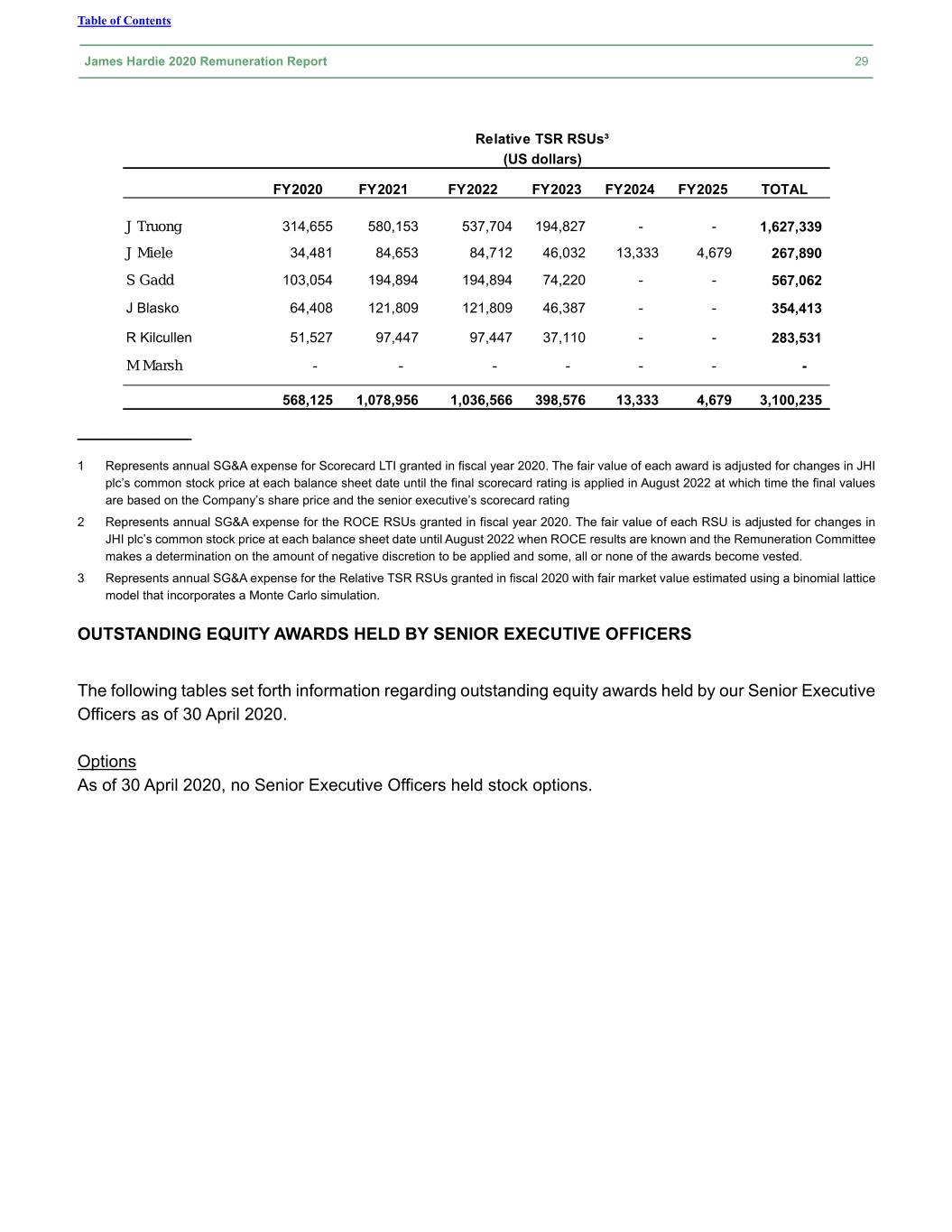Table of Contents James Hardie 2020 Remuneration Report 29 Relative TSR RSUs³ (US dollars) FY2020 FY2021 FY2022 FY2023 FY2024 FY2025 TOTAL J Truong 314,655 580,153 537,704 194,827 - - 1,627,339 J Miele 34,481 84,653 84,712 46,032 13,333 4,679 267,890 S Gadd 103,054 194,894 194,894 74,220 - - 567,062 J Blasko 64,408 121,809 121,809 46,387 - - 354,413 R Kilcullen 51,527 97,447 97,447 37,110 - - 283,531 M Marsh - - - - - - - 568,125 1,078,956 1,036,566 398,576 13,333 4,679 3,100,235 ____________ 1 Represents annual SG&A expense for Scorecard LTI granted in fiscal year 2020. The fair value of each award is adjusted for changes in JHI plc’s common stock price at each balance sheet date until the final scorecard rating is applied in August 2022 at which time the final values are based on the Company’s share price and the senior executive’s scorecard rating 2 Represents annual SG&A expense for the ROCE RSUs granted in fiscal year 2020. The fair value of each RSU is adjusted for changes in JHI plc’s common stock price at each balance sheet date until August 2022 when ROCE results are known and the Remuneration Committee makes a determination on the amount of negative discretion to be applied and some, all or none of the awards become vested. 3 Represents annual SG&A expense for the Relative TSR RSUs granted in fiscal 2020 with fair market value estimated using a binomial lattice model that incorporates a Monte Carlo simulation. OUTSTANDING EQUITY AWARDS HELD BY SENIOR EXECUTIVE OFFICERS The following tables set forth information regarding outstanding equity awards held by our Senior Executive Officers as of 30 April 2020. Options As of 30 April 2020, no Senior Executive Officers held stock options.