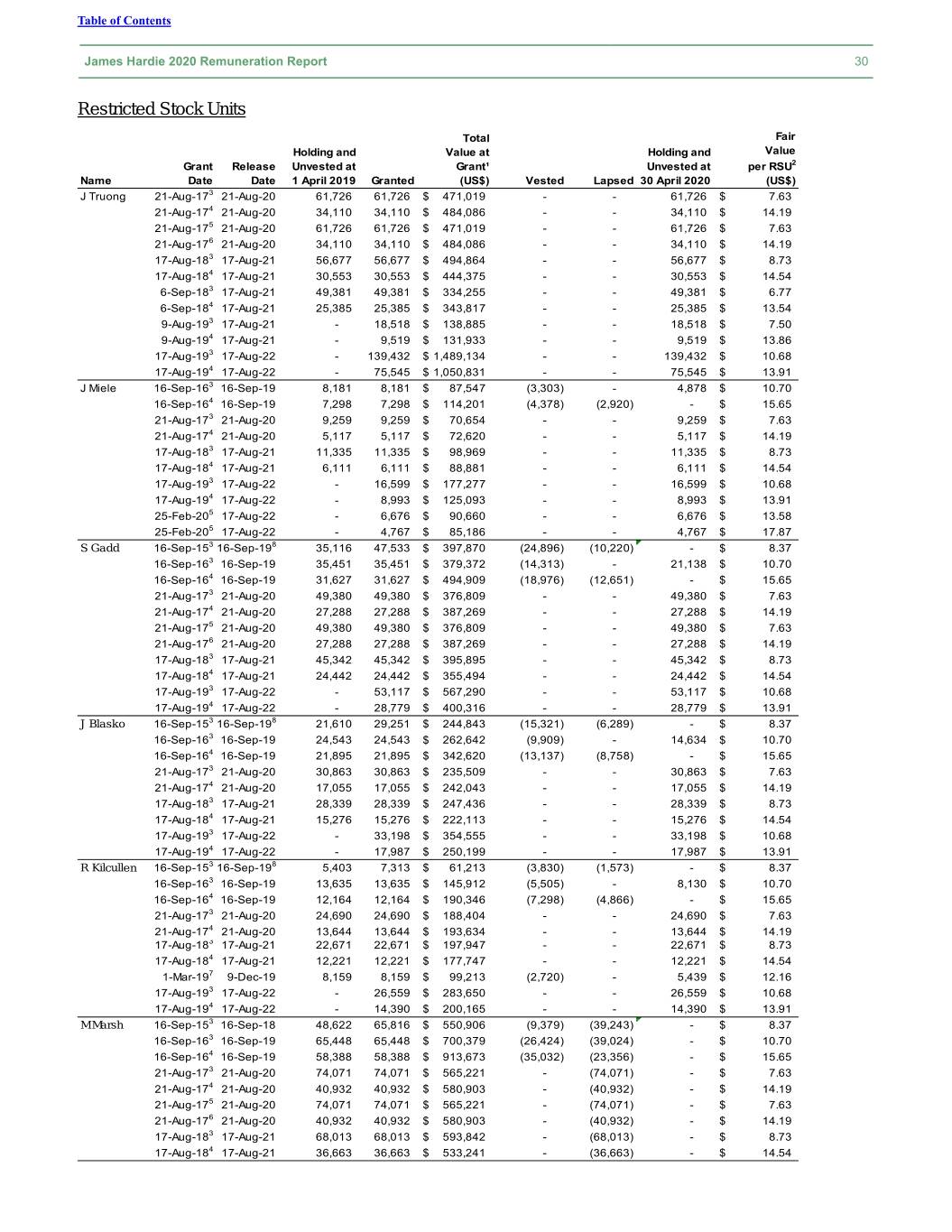 Table of Contents James Hardie 2020 Remuneration Report 30 Restricted Stock Units Total Fa ir Holding and Value at Holding and Value Gr a nt Release Unvested at Gr a nt¹ Unvested at per RSU2 Name Date Date 1 April 2019 Granted (US$) Vested Lapsed 30 April 2020 (US$) J Truong 21-Aug-173 21-Aug-20 61,726 61,726 $ 471,019 - - 61,726 $ 7.63 21-Aug-174 21-Aug-20 34,110 34,110 $ 484,086 - - 34,110 $ 14.19 21-Aug-175 21-Aug-20 61,726 61,726 $ 471,019 - - 61,726 $ 7.63 21-Aug-176 21-Aug-20 34,110 34,110 $ 484,086 - - 34,110 $ 14.19 17-Aug-183 17-Aug-21 56,677 56,677 $ 494,864 - - 56,677 $ 8.73 17-Aug-184 17-Aug-21 30,553 30,553 $ 444,375 - - 30,553 $ 14.54 6-Sep-183 17-Aug-21 49,381 49,381 $ 334,255 - - 49,381 $ 6.77 6-Sep-184 17-Aug-21 25,385 25,385 $ 343,817 - - 25,385 $ 13.54 9-Aug-193 17-Aug-21 - 18,518 $ 138,885 - - 18,518 $ 7.50 9-Aug-194 17-Aug-21 - 9,519 $ 131,933 - - 9,519 $ 13.86 17-Aug-193 17-Aug-22 - 139,432 $ 1,489,134 - - 139,432 $ 10.68 17-Aug-194 17-Aug-22 - 75,545 $ 1,050,831 - - 75,545 $ 13.91 J Miele 16-Sep-163 16-Sep-19 8,181 8,181 $ 87,547 (3,303) - 4,878 $ 10.70 16-Sep-164 16-Sep-19 7,298 7,298 $ 114,201 (4,378) (2,920) - $ 15.65 21-Aug-173 21-Aug-20 9,259 9,259 $ 70,654 - - 9,259 $ 7.63 21-Aug-174 21-Aug-20 5,117 5,117 $ 72,620 - - 5,117 $ 14.19 17-Aug-183 17-Aug-21 11,335 11,335 $ 98,969 - - 11,335 $ 8.73 17-Aug-184 17-Aug-21 6,111 6,111 $ 88,881 - - 6,111 $ 14.54 17-Aug-193 17-Aug-22 - 16,599 $ 177,277 - - 16,599 $ 10.68 17-Aug-194 17-Aug-22 - 8,993 $ 125,093 - - 8,993 $ 13.91 25-Feb-205 17-Aug-22 - 6,676 $ 90,660 - - 6,676 $ 13.58 25-Feb-205 17-Aug-22 - 4,767 $ 85,186 - - 4,767 $ 17.87 S Gadd 16-Sep-153 16-Sep-198 35,116 47,533 $ 397,870 (24,896) (10,220) - $ 8.37 16-Sep-163 16-Sep-19 35,451 35,451 $ 379,372 (14,313) - 21,138 $ 10.70 16-Sep-164 16-Sep-19 31,627 31,627 $ 494,909 (18,976) (12,651) - $ 15.65 21-Aug-173 21-Aug-20 49,380 49,380 $ 376,809 - - 49,380 $ 7.63 21-Aug-174 21-Aug-20 27,288 27,288 $ 387,269 - - 27,288 $ 14.19 21-Aug-175 21-Aug-20 49,380 49,380 $ 376,809 - - 49,380 $ 7.63 21-Aug-176 21-Aug-20 27,288 27,288 $ 387,269 - - 27,288 $ 14.19 17-Aug-183 17-Aug-21 45,342 45,342 $ 395,895 - - 45,342 $ 8.73 17-Aug-184 17-Aug-21 24,442 24,442 $ 355,494 - - 24,442 $ 14.54 17-Aug-193 17-Aug-22 - 53,117 $ 567,290 - - 53,117 $ 10.68 17-Aug-194 17-Aug-22 - 28,779 $ 400,316 - - 28,779 $ 13.91 J Blasko 16-Sep-153 16-Sep-198 21,610 29,251 $ 244,843 (15,321) (6,289) - $ 8.37 16-Sep-163 16-Sep-19 24,543 24,543 $ 262,642 (9,909) - 14,634 $ 10.70 16-Sep-164 16-Sep-19 21,895 21,895 $ 342,620 (13,137) (8,758) - $ 15.65 21-Aug-173 21-Aug-20 30,863 30,863 $ 235,509 - - 30,863 $ 7.63 21-Aug-174 21-Aug-20 17,055 17,055 $ 242,043 - - 17,055 $ 14.19 17-Aug-183 17-Aug-21 28,339 28,339 $ 247,436 - - 28,339 $ 8.73 17-Aug-184 17-Aug-21 15,276 15,276 $ 222,113 - - 15,276 $ 14.54 17-Aug-193 17-Aug-22 - 33,198 $ 354,555 - - 33,198 $ 10.68 17-Aug-194 17-Aug-22 - 17,987 $ 250,199 - - 17,987 $ 13.91 R Kilcullen 16-Sep-153 16-Sep-198 5,403 7,313 $ 61,213 (3,830) (1,573) - $ 8.37 16-Sep-163 16-Sep-19 13,635 13,635 $ 145,912 (5,505) - 8,130 $ 10.70 16-Sep-164 16-Sep-19 12,164 12,164 $ 190,346 (7,298) (4,866) - $ 15.65 21-Aug-173 21-Aug-20 24,690 24,690 $ 188,404 - - 24,690 $ 7.63 21-Aug-174 21-Aug-20 13,644 13,644 $ 193,634 - - 13,644 $ 14.19 17-Aug-183 17-Aug-21 22,671 22,671 $ 197,947 - - 22,671 $ 8.73 17-Aug-184 17-Aug-21 12,221 12,221 $ 177,747 - - 12,221 $ 14.54 1-Mar-197 9-Dec-19 8,159 8,159 $ 99,213 (2,720) - 5,439 $ 12.16 17-Aug-193 17-Aug-22 - 26,559 $ 283,650 - - 26,559 $ 10.68 17-Aug-194 17-Aug-22 - 14,390 $ 200,165 - - 14,390 $ 13.91 M Marsh 16-Sep-153 16-Sep-18 48,622 65,816 $ 550,906 (9,379) (39,243) - $ 8.37 16-Sep-163 16-Sep-19 65,448 65,448 $ 700,379 (26,424) (39,024) - $ 10.70 16-Sep-164 16-Sep-19 58,388 58,388 $ 913,673 (35,032) (23,356) - $ 15.65 21-Aug-173 21-Aug-20 74,071 74,071 $ 565,221 - (74,071) - $ 7.63 21-Aug-174 21-Aug-20 40,932 40,932 $ 580,903 - (40,932) - $ 14.19 21-Aug-175 21-Aug-20 74,071 74,071 $ 565,221 - (74,071) - $ 7.63 21-Aug-176 21-Aug-20 40,932 40,932 $ 580,903 - (40,932) - $ 14.19 17-Aug-183 17-Aug-21 68,013 68,013 $ 593,842 - (68,013) - $ 8.73 17-Aug-184 17-Aug-21 36,663 36,663 $ 533,241 - (36,663) - $ 14.54