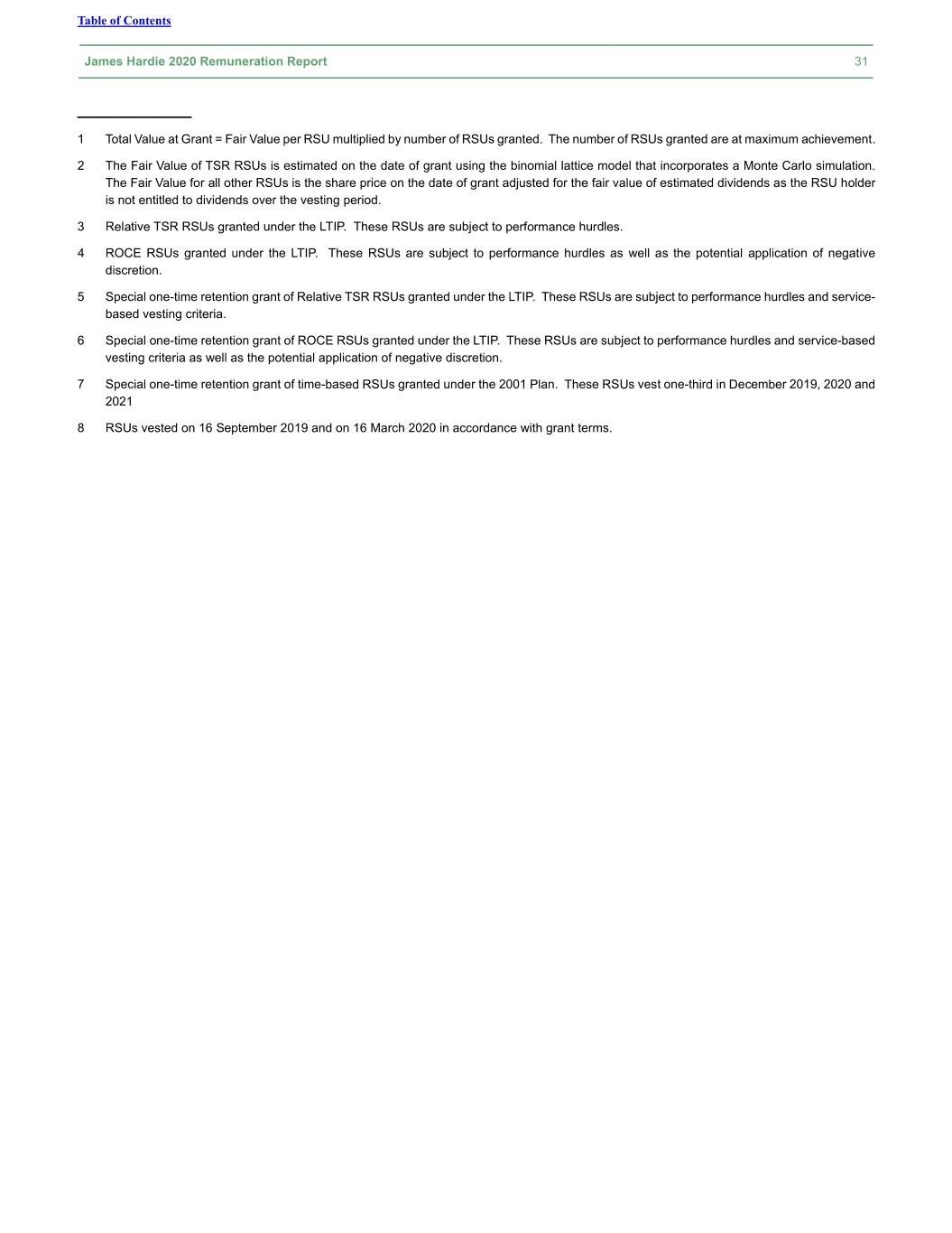 Table of Contents James Hardie 2020 Remuneration Report 31 ____________ 1 Total Value at Grant = Fair Value per RSU multiplied by number of RSUs granted. The number of RSUs granted are at maximum achievement. 2 The Fair Value of TSR RSUs is estimated on the date of grant using the binomial lattice model that incorporates a Monte Carlo simulation. The Fair Value for all other RSUs is the share price on the date of grant adjusted for the fair value of estimated dividends as the RSU holder is not entitled to dividends over the vesting period. 3 Relative TSR RSUs granted under the LTIP. These RSUs are subject to performance hurdles. 4 ROCE RSUs granted under the LTIP. These RSUs are subject to performance hurdles as well as the potential application of negative discretion. 5 Special one-time retention grant of Relative TSR RSUs granted under the LTIP. These RSUs are subject to performance hurdles and service- based vesting criteria. 6 Special one-time retention grant of ROCE RSUs granted under the LTIP. These RSUs are subject to performance hurdles and service-based vesting criteria as well as the potential application of negative discretion. 7 Special one-time retention grant of time-based RSUs granted under the 2001 Plan. These RSUs vest one-third in December 2019, 2020 and 2021 8 RSUs vested on 16 September 2019 and on 16 March 2020 in accordance with grant terms.