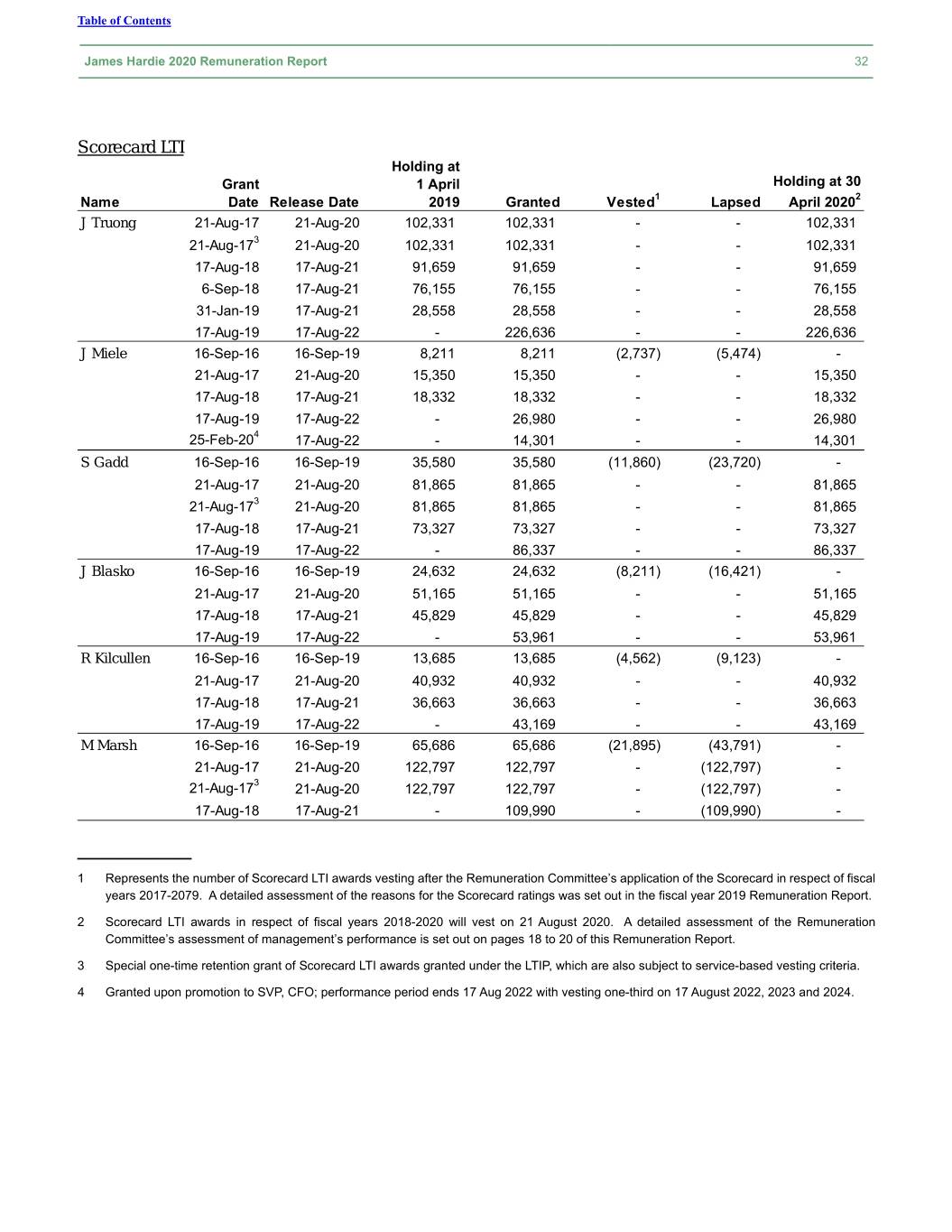 Table of Contents James Hardie 2020 Remuneration Report 32 Scorecard LTI Holding at Grant 1 April Holding at 30 Name Date Release Date 2019 Granted Vested1 Lapsed April 20202 J Truong 21-Aug-17 21-Aug-20 102,331 102,331 - - 102,331 21-Aug-173 21-Aug-20 102,331 102,331 - - 102,331 17-Aug-18 17-Aug-21 91,659 91,659 - - 91,659 6-Sep-18 17-Aug-21 76,155 76,155 - - 76,155 31-Jan-19 17-Aug-21 28,558 28,558 - - 28,558 17-Aug-19 17-Aug-22 - 226,636 - - 226,636 J Miele 16-Sep-16 16-Sep-19 8,211 8,211 (2,737) (5,474) - 21-Aug-17 21-Aug-20 15,350 15,350 - - 15,350 17-Aug-18 17-Aug-21 18,332 18,332 - - 18,332 17-Aug-19 17-Aug-22 - 26,980 - - 26,980 25-Feb-204 17-Aug-22 - 14,301 - - 14,301 S Gadd 16-Sep-16 16-Sep-19 35,580 35,580 (11,860) (23,720) - 21-Aug-17 21-Aug-20 81,865 81,865 - - 81,865 21-Aug-173 21-Aug-20 81,865 81,865 - - 81,865 17-Aug-18 17-Aug-21 73,327 73,327 - - 73,327 17-Aug-19 17-Aug-22 - 86,337 - - 86,337 J Blasko 16-Sep-16 16-Sep-19 24,632 24,632 (8,211) (16,421) - 21-Aug-17 21-Aug-20 51,165 51,165 - - 51,165 17-Aug-18 17-Aug-21 45,829 45,829 - - 45,829 17-Aug-19 17-Aug-22 - 53,961 - - 53,961 R Kilcullen 16-Sep-16 16-Sep-19 13,685 13,685 (4,562) (9,123) - 21-Aug-17 21-Aug-20 40,932 40,932 - - 40,932 17-Aug-18 17-Aug-21 36,663 36,663 - - 36,663 17-Aug-19 17-Aug-22 - 43,169 - - 43,169 M Marsh 16-Sep-16 16-Sep-19 65,686 65,686 (21,895) (43,791) - 21-Aug-17 21-Aug-20 122,797 122,797 - (122,797) - 21-Aug-173 21-Aug-20 122,797 122,797 - (122,797) - 17-Aug-18 17-Aug-21 - 109,990 - (109,990) - ____________ 1 Represents the number of Scorecard LTI awards vesting after the Remuneration Committee’s application of the Scorecard in respect of fiscal years 2017-2079. A detailed assessment of the reasons for the Scorecard ratings was set out in the fiscal year 2019 Remuneration Report. 2 Scorecard LTI awards in respect of fiscal years 2018-2020 will vest on 21 August 2020. A detailed assessment of the Remuneration Committee’s assessment of management’s performance is set out on pages 18 to 20 of this Remuneration Report. 3 Special one-time retention grant of Scorecard LTI awards granted under the LTIP, which are also subject to service-based vesting criteria. 4 Granted upon promotion to SVP, CFO; performance period ends 17 Aug 2022 with vesting one-third on 17 August 2022, 2023 and 2024.