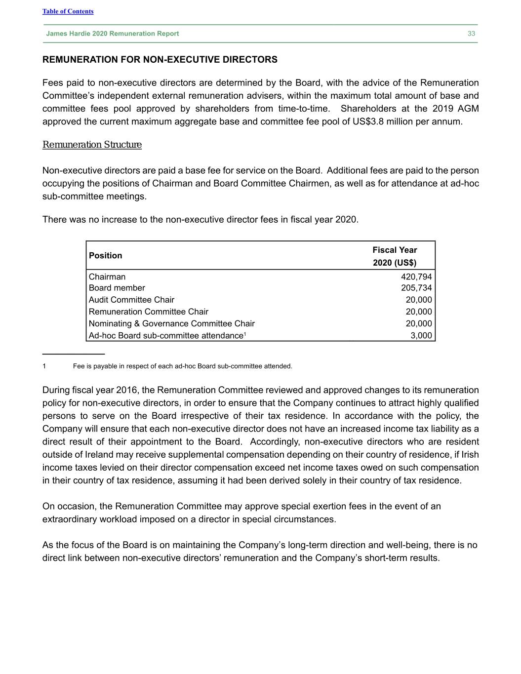Table of Contents James Hardie 2020 Remuneration Report 33 REMUNERATION FOR NON-EXECUTIVE DIRECTORS Fees paid to non-executive directors are determined by the Board, with the advice of the Remuneration Committee’s independent external remuneration advisers, within the maximum total amount of base and committee fees pool approved by shareholders from time-to-time. Shareholders at the 2019 AGM approved the current maximum aggregate base and committee fee pool of US$3.8 million per annum. Remuneration Structure Non-executive directors are paid a base fee for service on the Board. Additional fees are paid to the person occupying the positions of Chairman and Board Committee Chairmen, as well as for attendance at ad-hoc sub-committee meetings. There was no increase to the non-executive director fees in fiscal year 2020. Fiscal Year Position 2020 (US$) Chairman 420,794 Board member 205,734 Audit Committee Chair 20,000 Remuneration Committee Chair 20,000 Nominating & Governance Committee Chair 20,000 Ad-hoc Board sub-committee attendance1 3,000 ____________ 1 Fee is payable in respect of each ad-hoc Board sub-committee attended. During fiscal year 2016, the Remuneration Committee reviewed and approved changes to its remuneration policy for non-executive directors, in order to ensure that the Company continues to attract highly qualified persons to serve on the Board irrespective of their tax residence. In accordance with the policy, the Company will ensure that each non-executive director does not have an increased income tax liability as a direct result of their appointment to the Board. Accordingly, non-executive directors who are resident outside of Ireland may receive supplemental compensation depending on their country of residence, if Irish income taxes levied on their director compensation exceed net income taxes owed on such compensation in their country of tax residence, assuming it had been derived solely in their country of tax residence. On occasion, the Remuneration Committee may approve special exertion fees in the event of an extraordinary workload imposed on a director in special circumstances. As the focus of the Board is on maintaining the Company’s long-term direction and well-being, there is no direct link between non-executive directors’ remuneration and the Company’s short-term results.