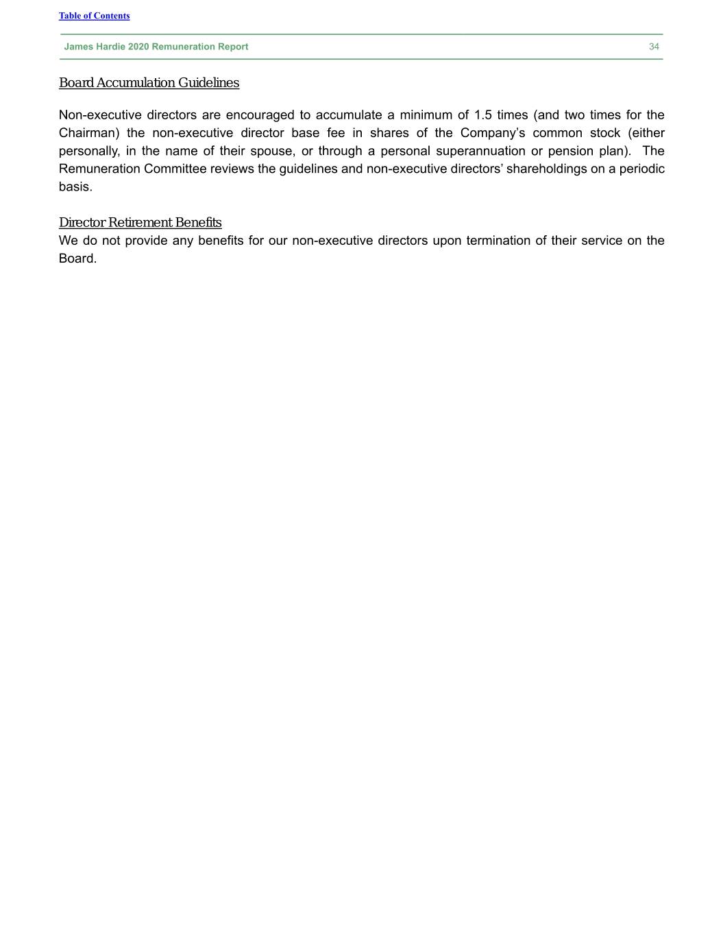 Table of Contents James Hardie 2020 Remuneration Report 34 Board Accumulation Guidelines Non-executive directors are encouraged to accumulate a minimum of 1.5 times (and two times for the Chairman) the non-executive director base fee in shares of the Company’s common stock (either personally, in the name of their spouse, or through a personal superannuation or pension plan). The Remuneration Committee reviews the guidelines and non-executive directors’ shareholdings on a periodic basis. Director Retirement Benefits We do not provide any benefits for our non-executive directors upon termination of their service on the Board.