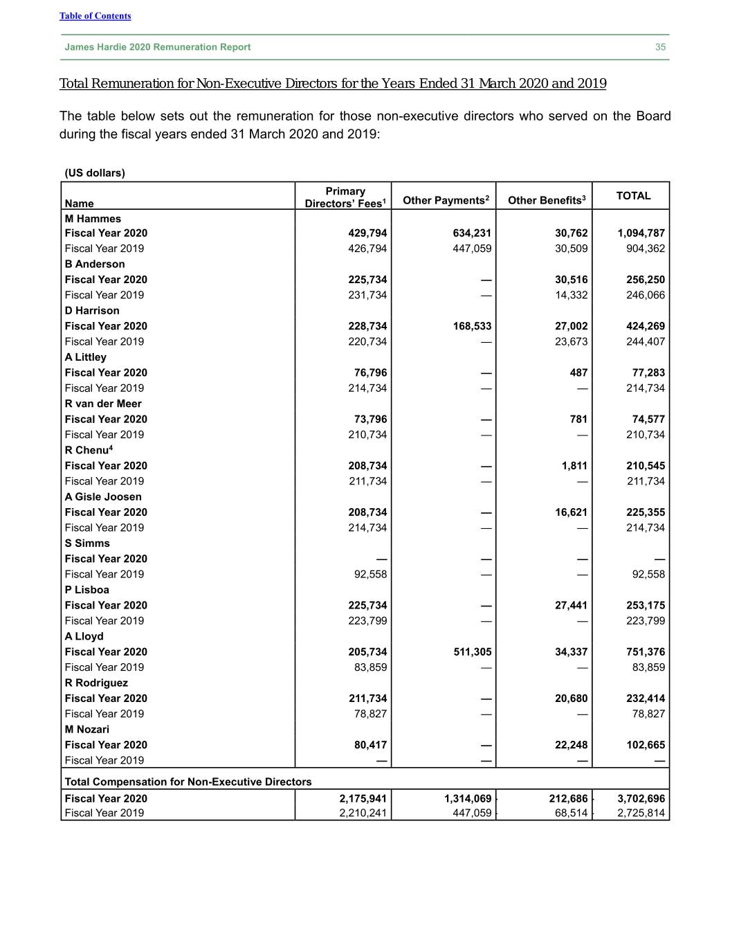 Table of Contents James Hardie 2020 Remuneration Report 35 Total Remuneration for Non-Executive Directors for the Years Ended 31 March 2020 and 2019 The table below sets out the remuneration for those non-executive directors who served on the Board during the fiscal years ended 31 March 2020 and 2019: (US dollars) Primary 2 3 TOTAL Name Directors’ Fees1 Other Payments Other Benefits M Hammes Fiscal Year 2020 429,794 634,231 30,762 1,094,787 Fiscal Year 2019 426,794 447,059 30,509 904,362 B Anderson Fiscal Year 2020 225,734 — 30,516 256,250 Fiscal Year 2019 231,734 — 14,332 246,066 D Harrison Fiscal Year 2020 228,734 168,533 27,002 424,269 Fiscal Year 2019 220,734 — 23,673 244,407 A Littley Fiscal Year 2020 76,796 — 487 77,283 Fiscal Year 2019 214,734 — — 214,734 R van der Meer Fiscal Year 2020 73,796 — 781 74,577 Fiscal Year 2019 210,734 — — 210,734 R Chenu4 Fiscal Year 2020 208,734 — 1,811 210,545 Fiscal Year 2019 211,734 — — 211,734 A Gisle Joosen Fiscal Year 2020 208,734 — 16,621 225,355 Fiscal Year 2019 214,734 — — 214,734 S Simms Fiscal Year 2020 — — — — Fiscal Year 2019 92,558 — — 92,558 P Lisboa Fiscal Year 2020 225,734 — 27,441 253,175 Fiscal Year 2019 223,799 — — 223,799 A Lloyd Fiscal Year 2020 205,734 511,305 34,337 751,376 Fiscal Year 2019 83,859 — — 83,859 R Rodriguez Fiscal Year 2020 211,734 — 20,680 232,414 Fiscal Year 2019 78,827 — — 78,827 M Nozari Fiscal Year 2020 80,417 — 22,248 102,665 Fiscal Year 2019 — — — — Total Compensation for Non-Executive Directors Fiscal Year 2020 2,175,941 1,314,069 — 212,686 — 3,702,696 Fiscal Year 2019 2,210,241 447,059 — 68,514 — 2,725,814