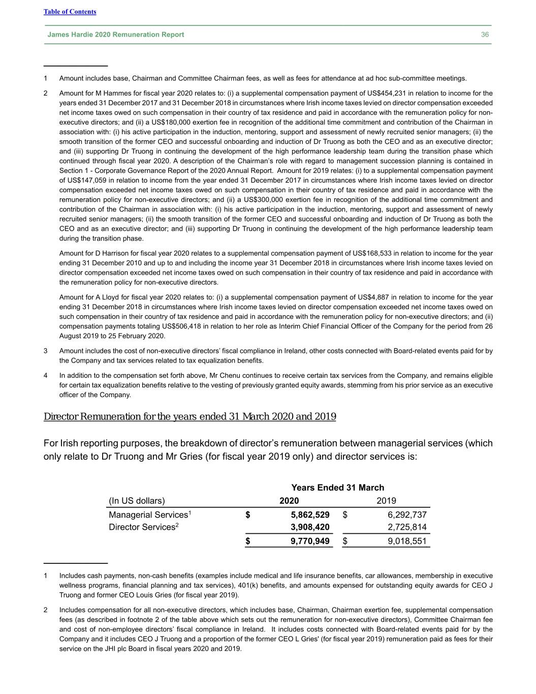 Table of Contents James Hardie 2020 Remuneration Report 36 ____________ 1 Amount includes base, Chairman and Committee Chairman fees, as well as fees for attendance at ad hoc sub-committee meetings. 2 Amount for M Hammes for fiscal year 2020 relates to: (i) a supplemental compensation payment of US$454,231 in relation to income for the years ended 31 December 2017 and 31 December 2018 in circumstances where Irish income taxes levied on director compensation exceeded net income taxes owed on such compensation in their country of tax residence and paid in accordance with the remuneration policy for non- executive directors; and (ii) a US$180,000 exertion fee in recognition of the additional time commitment and contribution of the Chairman in association with: (i) his active participation in the induction, mentoring, support and assessment of newly recruited senior managers; (ii) the smooth transition of the former CEO and successful onboarding and induction of Dr Truong as both the CEO and as an executive director; and (iii) supporting Dr Truong in continuing the development of the high performance leadership team during the transition phase which continued through fiscal year 2020. A description of the Chairman’s role with regard to management succession planning is contained in Section 1 - Corporate Governance Report of the 2020 Annual Report. Amount for 2019 relates: (i) to a supplemental compensation payment of US$147,059 in relation to income from the year ended 31 December 2017 in circumstances where Irish income taxes levied on director compensation exceeded net income taxes owed on such compensation in their country of tax residence and paid in accordance with the remuneration policy for non-executive directors; and (ii) a US$300,000 exertion fee in recognition of the additional time commitment and contribution of the Chairman in association with: (i) his active participation in the induction, mentoring, support and assessment of newly recruited senior managers; (ii) the smooth transition of the former CEO and successful onboarding and induction of Dr Truong as both the CEO and as an executive director; and (iii) supporting Dr Truong in continuing the development of the high performance leadership team during the transition phase. Amount for D Harrison for fiscal year 2020 relates to a supplemental compensation payment of US$168,533 in relation to income for the year ending 31 December 2010 and up to and including the income year 31 December 2018 in circumstances where Irish income taxes levied on director compensation exceeded net income taxes owed on such compensation in their country of tax residence and paid in accordance with the remuneration policy for non-executive directors. Amount for A Lloyd for fiscal year 2020 relates to: (i) a supplemental compensation payment of US$4,887 in relation to income for the year ending 31 December 2018 in circumstances where Irish income taxes levied on director compensation exceeded net income taxes owed on such compensation in their country of tax residence and paid in accordance with the remuneration policy for non-executive directors; and (ii) compensation payments totaling US$506,418 in relation to her role as Interim Chief Financial Officer of the Company for the period from 26 August 2019 to 25 February 2020. 3 Amount includes the cost of non-executive directors’ fiscal compliance in Ireland, other costs connected with Board-related events paid for by the Company and tax services related to tax equalization benefits. 4 In addition to the compensation set forth above, Mr Chenu continues to receive certain tax services from the Company, and remains eligible for certain tax equalization benefits relative to the vesting of previously granted equity awards, stemming from his prior service as an executive officer of the Company. Director Remuneration for the years ended 31 March 2020 and 2019 For Irish reporting purposes, the breakdown of director’s remuneration between managerial services (which only relate to Dr Truong and Mr Gries (for fiscal year 2019 only) and director services is: Years Ended 31 March (In US dollars) 2020 2019 Managerial Services1 $ 5,862,529 $ 6,292,737 Director Services2 3,908,420 2,725,814 $ 9,770,949 $ 9,018,551 ____________ 1 Includes cash payments, non-cash benefits (examples include medical and life insurance benefits, car allowances, membership in executive wellness programs, financial planning and tax services), 401(k) benefits, and amounts expensed for outstanding equity awards for CEO J Truong and former CEO Louis Gries (for fiscal year 2019). 2 Includes compensation for all non-executive directors, which includes base, Chairman, Chairman exertion fee, supplemental compensation fees (as described in footnote 2 of the table above which sets out the remuneration for non-executive directors), Committee Chairman fee and cost of non-employee directors’ fiscal compliance in Ireland. It includes costs connected with Board-related events paid for by the Company and it includes CEO J Truong and a proportion of the former CEO L Gries' (for fiscal year 2019) remuneration paid as fees for their service on the JHI plc Board in fiscal years 2020 and 2019.