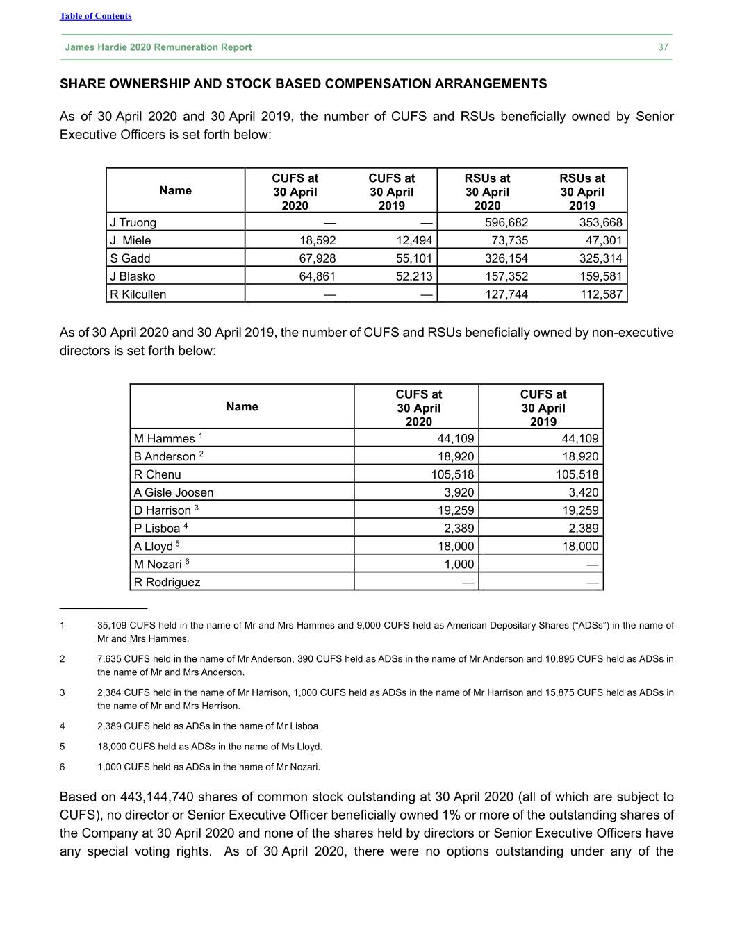 Table of Contents James Hardie 2020 Remuneration Report 37 SHARE OWNERSHIP AND STOCK BASED COMPENSATION ARRANGEMENTS As of 30 April 2020 and 30 April 2019, the number of CUFS and RSUs beneficially owned by Senior Executive Officers is set forth below: CUFS at CUFS at RSUs at RSUs at Name 30 April 30 April 30 April 30 April 2020 2019 2020 2019 J Truong — — 596,682 353,668 J Miele 18,592 12,494 73,735 47,301 8 S Gadd 67,928 55,101 326,154 325,314 J Blasko 64,861 52,213 157,352 159,581 R Kilcullen — — 127,744 112,587 As of 30 April 2020 and 30 April 2019, the number of CUFS and RSUs beneficially owned by non-executive directors is set forth below: CUFS at CUFS at Name 30 April 30 April 2020 2019 M Hammes 1 44,109 44,109 B Anderson 2 18,920 18,920 R Chenu 105,518 105,518 A Gisle Joosen 3,920 3,420 D Harrison 3 19,259 19,259 P Lisboa 4 2,389 2,389 A Lloyd 5 18,000 18,000 M Nozari 6 1,000 — R Rodriguez — — ____________ 1 35,109 CUFS held in the name of Mr and Mrs Hammes and 9,000 CUFS held as American Depositary Shares (“ADSs”) in the name of Mr and Mrs Hammes. 2 7,635 CUFS held in the name of Mr Anderson, 390 CUFS held as ADSs in the name of Mr Anderson and 10,895 CUFS held as ADSs in the name of Mr and Mrs Anderson. 3 2,384 CUFS held in the name of Mr Harrison, 1,000 CUFS held as ADSs in the name of Mr Harrison and 15,875 CUFS held as ADSs in the name of Mr and Mrs Harrison. 4 2,389 CUFS held as ADSs in the name of Mr Lisboa. 5 18,000 CUFS held as ADSs in the name of Ms Lloyd. 6 1,000 CUFS held as ADSs in the name of Mr Nozari. Based on 443,144,740 shares of common stock outstanding at 30 April 2020 (all of which are subject to CUFS), no director or Senior Executive Officer beneficially owned 1% or more of the outstanding shares of the Company at 30 April 2020 and none of the shares held by directors or Senior Executive Officers have any special voting rights. As of 30 April 2020, there were no options outstanding under any of the