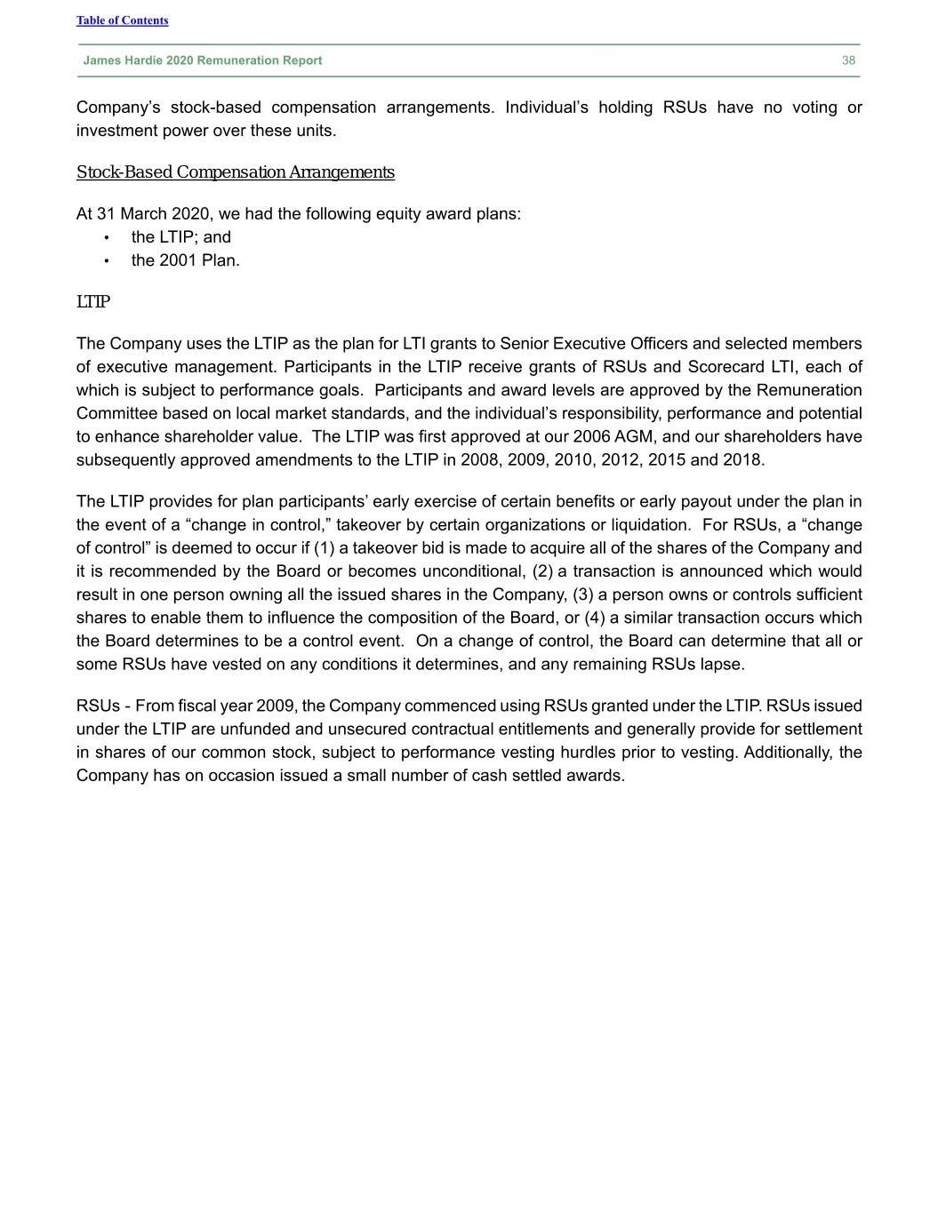 Table of Contents James Hardie 2020 Remuneration Report 38 Company’s stock-based compensation arrangements. Individual’s holding RSUs have no voting or investment power over these units. Stock-Based Compensation Arrangements At 31 March 2020, we had the following equity award plans: • the LTIP; and • the 2001 Plan. LTIP The Company uses the LTIP as the plan for LTI grants to Senior Executive Officers and selected members of executive management. Participants in the LTIP receive grants of RSUs and Scorecard LTI, each of which is subject to performance goals. Participants and award levels are approved by the Remuneration Committee based on local market standards, and the individual’s responsibility, performance and potential to enhance shareholder value. The LTIP was first approved at our 2006 AGM, and our shareholders have subsequently approved amendments to the LTIP in 2008, 2009, 2010, 2012, 2015 and 2018. The LTIP provides for plan participants’ early exercise of certain benefits or early payout under the plan in the event of a “change in control,” takeover by certain organizations or liquidation. For RSUs, a “change of control” is deemed to occur if (1) a takeover bid is made to acquire all of the shares of the Company and it is recommended by the Board or becomes unconditional, (2) a transaction is announced which would result in one person owning all the issued shares in the Company, (3) a person owns or controls sufficient shares to enable them to influence the composition of the Board, or (4) a similar transaction occurs which the Board determines to be a control event. On a change of control, the Board can determine that all or some RSUs have vested on any conditions it determines, and any remaining RSUs lapse. RSUs - From fiscal year 2009, the Company commenced using RSUs granted under the LTIP. RSUs issued under the LTIP are unfunded and unsecured contractual entitlements and generally provide for settlement in shares of our common stock, subject to performance vesting hurdles prior to vesting. Additionally, the Company has on occasion issued a small number of cash settled awards.