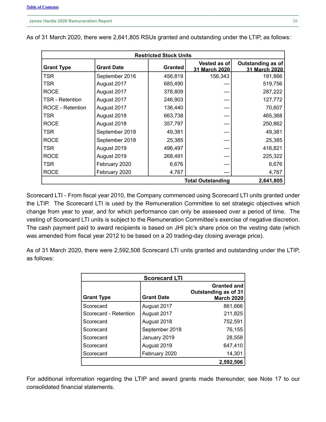 Table of Contents James Hardie 2020 Remuneration Report 39 As of 31 March 2020, there were 2,641,805 RSUs granted and outstanding under the LTIP, as follows: Restricted Stock Units Vested as of Outstanding as of Grant Type Grant Date Granted 31 March 2020 31 March 2020 TSR September 2016 456,819 156,343 191,866 TSR August 2017 685,490 — 519,756 ROCE August 2017 378,809 — 287,222 TSR - Retention August 2017 246,903 — 127,772 ROCE - Retention August 2017 136,440 — 70,607 TSR August 2018 663,738 — 465,368 ROCE August 2018 357,797 — 250,862 TSR September 2018 49,381 — 49,381 ROCE September 2018 25,385 — 25,385 TSR August 2019 496,497 — 416,821 ROCE August 2019 268,491 — 225,322 TSR February 2020 6,676 — 6,676 ROCE February 2020 4,767 — 4,767 Total Outstanding 2,641,805 Scorecard LTI - From fiscal year 2010, the Company commenced using Scorecard LTI units granted under the LTIP. The Scorecard LTI is used by the Remuneration Committee to set strategic objectives which change from year to year, and for which performance can only be assessed over a period of time. The vesting of Scorecard LTI units is subject to the Remuneration Committee’s exercise of negative discretion. The cash payment paid to award recipients is based on JHI plc’s share price on the vesting date (which was amended from fiscal year 2012 to be based on a 20 trading-day closing average price). As of 31 March 2020, there were 2,592,506 Scorecard LTI units granted and outstanding under the LTIP, as follows: Scorecard LTI Granted and Outstanding as of 31 Grant Type Grant Date March 2020 Scorecard August 2017 861,666 Scorecard - Retention August 2017 211,825 Scorecard August 2018 752,591 Scorecard September 2018 76,155 Scorecard January 2019 28,558 Scorecard August 2019 647,410 Scorecard February 2020 14,301 2,592,506 For additional information regarding the LTIP and award grants made thereunder, see Note 17 to our consolidated financial statements.