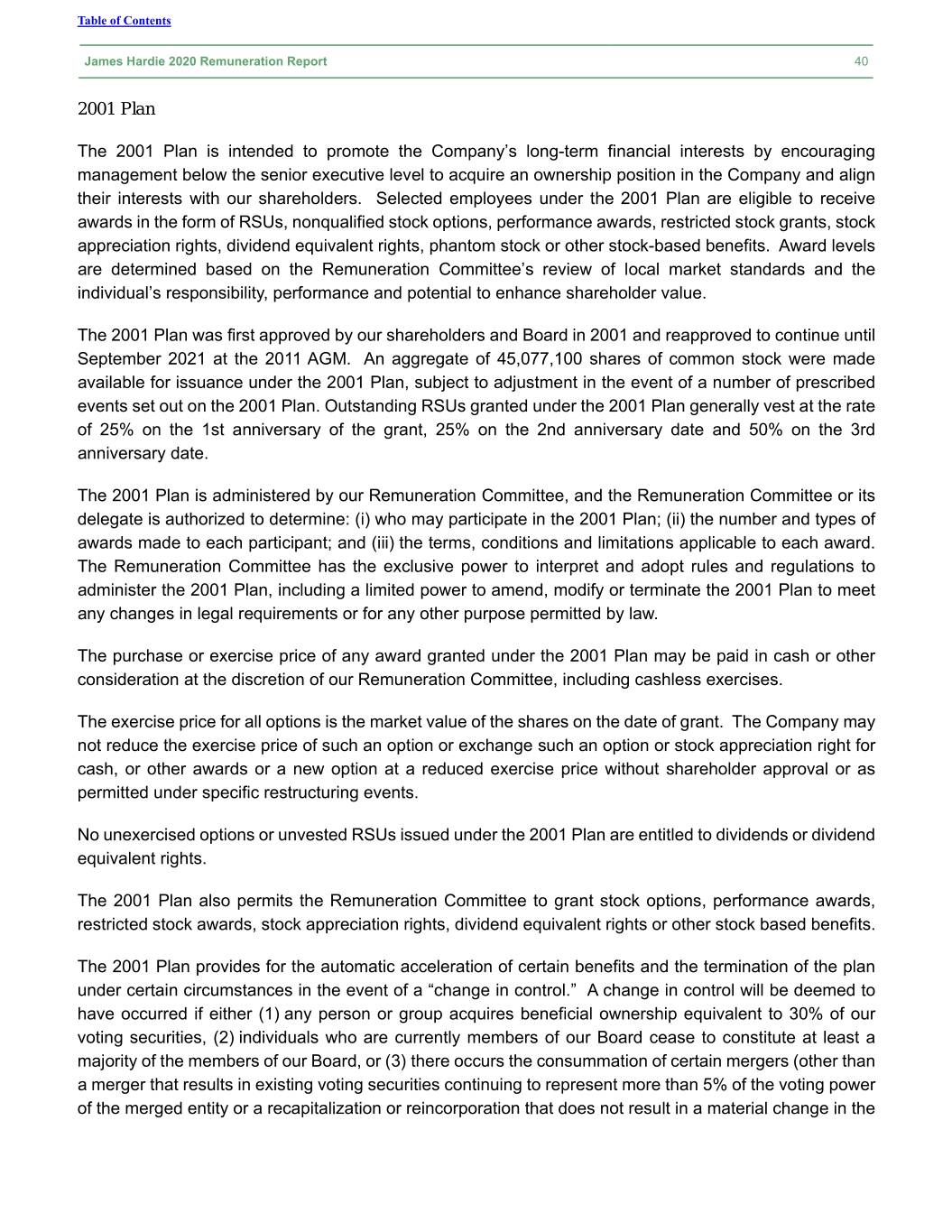 Table of Contents James Hardie 2020 Remuneration Report 40 2001 Plan The 2001 Plan is intended to promote the Company’s long-term financial interests by encouraging management below the senior executive level to acquire an ownership position in the Company and align their interests with our shareholders. Selected employees under the 2001 Plan are eligible to receive awards in the form of RSUs, nonqualified stock options, performance awards, restricted stock grants, stock appreciation rights, dividend equivalent rights, phantom stock or other stock-based benefits. Award levels are determined based on the Remuneration Committee’s review of local market standards and the individual’s responsibility, performance and potential to enhance shareholder value. The 2001 Plan was first approved by our shareholders and Board in 2001 and reapproved to continue until September 2021 at the 2011 AGM. An aggregate of 45,077,100 shares of common stock were made available for issuance under the 2001 Plan, subject to adjustment in the event of a number of prescribed events set out on the 2001 Plan. Outstanding RSUs granted under the 2001 Plan generally vest at the rate of 25% on the 1st anniversary of the grant, 25% on the 2nd anniversary date and 50% on the 3rd anniversary date. The 2001 Plan is administered by our Remuneration Committee, and the Remuneration Committee or its delegate is authorized to determine: (i) who may participate in the 2001 Plan; (ii) the number and types of awards made to each participant; and (iii) the terms, conditions and limitations applicable to each award. The Remuneration Committee has the exclusive power to interpret and adopt rules and regulations to administer the 2001 Plan, including a limited power to amend, modify or terminate the 2001 Plan to meet any changes in legal requirements or for any other purpose permitted by law. The purchase or exercise price of any award granted under the 2001 Plan may be paid in cash or other consideration at the discretion of our Remuneration Committee, including cashless exercises. The exercise price for all options is the market value of the shares on the date of grant. The Company may not reduce the exercise price of such an option or exchange such an option or stock appreciation right for cash, or other awards or a new option at a reduced exercise price without shareholder approval or as permitted under specific restructuring events. No unexercised options or unvested RSUs issued under the 2001 Plan are entitled to dividends or dividend equivalent rights. The 2001 Plan also permits the Remuneration Committee to grant stock options, performance awards, restricted stock awards, stock appreciation rights, dividend equivalent rights or other stock based benefits. The 2001 Plan provides for the automatic acceleration of certain benefits and the termination of the plan under certain circumstances in the event of a “change in control.” A change in control will be deemed to have occurred if either (1) any person or group acquires beneficial ownership equivalent to 30% of our voting securities, (2) individuals who are currently members of our Board cease to constitute at least a majority of the members of our Board, or (3) there occurs the consummation of certain mergers (other than a merger that results in existing voting securities continuing to represent more than 5% of the voting power of the merged entity or a recapitalization or reincorporation that does not result in a material change in the