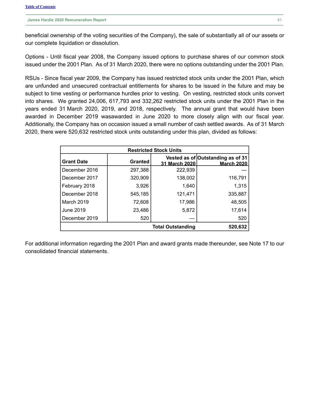 Table of Contents James Hardie 2020 Remuneration Report 41 beneficial ownership of the voting securities of the Company), the sale of substantially all of our assets or our complete liquidation or dissolution. Options - Until fiscal year 2008, the Company issued options to purchase shares of our common stock issued under the 2001 Plan. As of 31 March 2020, there were no options outstanding under the 2001 Plan. RSUs - Since fiscal year 2009, the Company has issued restricted stock units under the 2001 Plan, which are unfunded and unsecured contractual entitlements for shares to be issued in the future and may be subject to time vesting or performance hurdles prior to vesting. On vesting, restricted stock units convert into shares. We granted 24,006, 617,793 and 332,262 restricted stock units under the 2001 Plan in the years ended 31 March 2020, 2019, and 2018, respectively. The annual grant that would have been awarded in December 2019 wasawarded in June 2020 to more closely align with our fiscal year. Additionally, the Company has on occasion issued a small number of cash settled awards. As of 31 March 2020, there were 520,632 restricted stock units outstanding under this plan, divided as follows: Restricted Stock Units Vested as of Outstanding as of 31 Grant Date Granted 31 March 2020 March 2020 December 2016 297,388 222,939 — December 2017 320,909 138,002 116,791 February 2018 3,926 1,640 1,315 December 2018 545,185 121,471 335,887 March 2019 72,608 17,986 48,505 June 2019 23,486 5,872 17,614 December 2019 520 — 520 Total Outstanding 520,632 For additional information regarding the 2001 Plan and award grants made thereunder, see Note 17 to our consolidated financial statements.