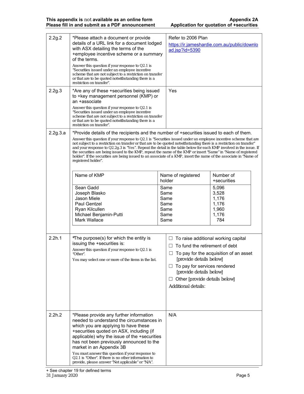 This appendix is not available as an online form Appendix 2A Please fill in and submit as a PDF announcement Application for quotation of +securities 2.2g.2 *Please attach a document or provide Refer to 2006 Plan details of a URL link for a document lodged https://ir.jameshardie.com.au/public/downlo with ASX detailing the terms of the ad.jsp?id=5390 +employee incentive scheme or a summary of the terms. Answer this question if your response to Q2.1 is “Securities issued under an employee incentive scheme that are not subject to a restriction on transfer or that are to be quoted notwithstanding there is a restriction on transfer”. 2.2g.3 *Are any of these +securities being issued Yes to +key management personnel (KMP) or an +associate Answer this question if your response to Q2.1 is “Securities issued under an employee incentive scheme that are not subject to a restriction on transfer or that are to be quoted notwithstanding there is a restriction on transfer”. 2.2g.3.a *Provide details of the recipients and the number of +securities issued to each of them. Answer this question if your response to Q2.1 is “Securities issued under an employee incentive scheme that are not subject to a restriction on transfer or that are to be quoted notwithstanding there is a restriction on transfer” and your response to Q2.2g.3 is “Yes”. Repeat the detail in the table below for each KMP involved in the issue. If the securities are being issued to the KMP, repeat the name of the KMP or insert “Same” in “Name of registered holder”. If the securities are being issued to an associate of a KMP, insert the name of the associate in “Name of registered holder”. Name of KMP Name of registered Number of holder +securities Sean Gadd Same 5,096 Joseph Blasko Same 3,528 Jason Miele Same 1,176 Paul Gentzel Same 1,176 Ryan Kilcullen Same 1,960 Michael Benjamin-Putti Same 1,176 Mark Wallace Same 784 2.2h.1 *The purpose(s) for which the entity is ☐ To raise additional working capital issuing the +securities is: ☐ To fund the retirement of debt Answer this question if your response to Q2.1 is “Other”. ☐ To pay for the acquisition of an asset You may select one or more of the items in the list. [provide details below] ☐ To pay for services rendered [provide details below] ☐ Other [provide details below] Additional details: 2.2h.2 *Please provide any further information N/A needed to understand the circumstances in which you are applying to have these +securities quoted on ASX, including (if applicable) why the issue of the +securities has not been previously announced to the market in an Appendix 3B You must answer this question if your response to Q2.1 is “Other”. If there is no other information to provide, please answer “Not applicable” or “N/A”. + See chapter 19 for defined terms 31 January 2020 Page 5
