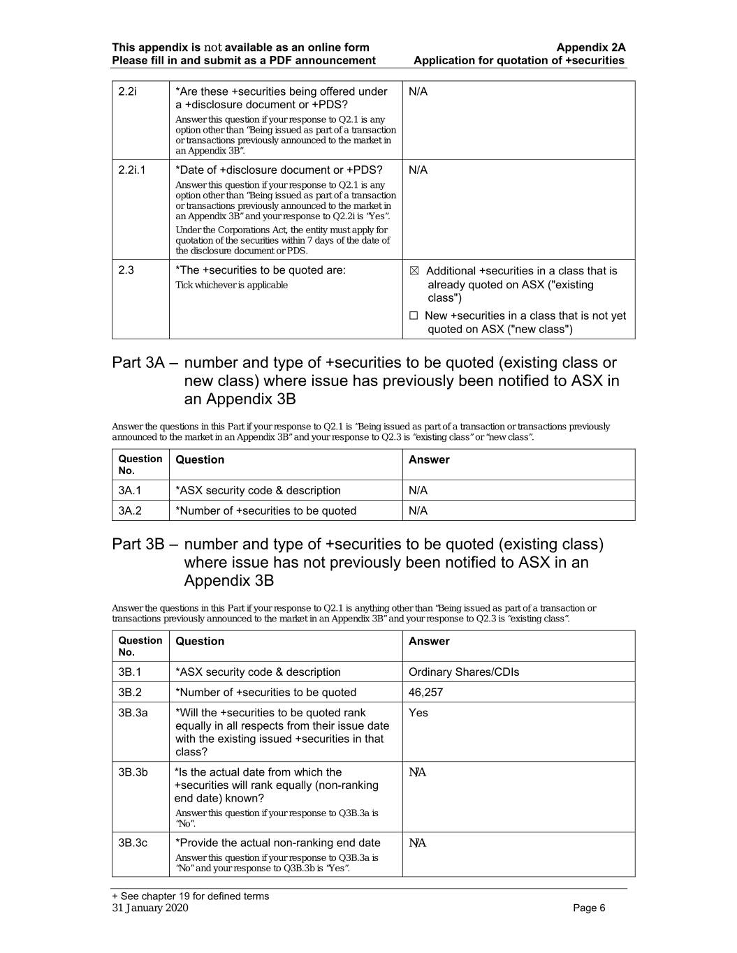 This appendix is not available as an online form Appendix 2A Please fill in and submit as a PDF announcement Application for quotation of +securities 2.2a.2.1 *Please provide details of the further issues N/A of +securities yet to take place to complete the transaction(s) referred to in the Appendix 3B Answer this question if your response to Q2.1 is “Being issued as part of a transaction or transactions previously announced to the market in an Appendix 3B” and your response to Q2.2a.2 is “Yes”. Please provide details of the proposed dates and number of securities for the further issues. This may be the case, for example, if the Appendix 3B related to an accelerated pro rata offer with an institutional component being quoted on one date and a retail component being quoted on a later date. 2.2b.1 *Date of Appendix 3A.1 lodged with ASX in N/A relation to the underlying +dividend or distribution Answer this question if your response to Q2.1 is “Being issued under a dividend or distribution plan”. 2.2b.2 *Does the +dividend or distribution plan N/A meet the requirement of listing rule 7.2 exception 4 that it does not impose a limit on participation? Answer this question if your response to Q2.1 is “Being issued under a dividend or distribution plan”. Note: Exception 4 only applies where security holders are able to elect to receive all of their dividend or distribution as securities. For example, Exception 4 would not apply in the following circumstances: 1) The entity has specified a dollar limit on the level of participation e.g. security holders can only participate to a maximum value of $x in respect of their entitlement, or 2) The entity has specified a maximum number of securities that can participate in the plan e.g. security holders can only receive securities in lieu of dividend payable for x number of securities. 2.2c.1 Please state the number and type of N/A options that were exercised or other +convertible securities that were converted (including their ASX security code) Answer this question if your response to Q2.1 is “Being issued as a result of options being exercised or other convertible securities being converted”. 2.2c.2 And the date the options were exercised or N/A other +convertible securities were converted Answer this question if your response to Q2.1 is “Being issued as a result of options being exercised or other convertible securities being converted”. Note: If this occurred over a range of dates, enter the date the last of the options was exercised or convertible securities was converted. 2.2d.1 Please state the number and type of partly N/A paid +securities (including their ASX security code) that were fully paid up Answer this question if your response to Q2.1 is “Unquoted partly paid securities that have been paid up and are now quoted fully paid securities”. + See chapter 19 for defined terms 31 January 2020 Page 3
