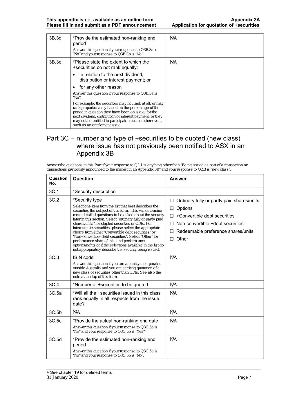 This appendix is not available as an online form Appendix 2A Please fill in and submit as a PDF announcement Application for quotation of +securities 3B.3d *Provide the estimated non-ranking end N/A period Answer this question if your response to Q3B.3a is “No” and your response to Q3B.3b is “No”. 3B.3e *Please state the extent to which the N/A +securities do not rank equally: in relation to the next dividend, distribution or interest payment; or for any other reason Answer this question if your response to Q3B.3a is “No”. For example, the securities may not rank at all, or may rank proportionately based on the percentage of the period in question they have been on issue, for the next dividend, distribution or interest payment; or they may not be entitled to participate in some other event, such as an entitlement issue. Part 3C – number and type of +securities to be quoted (new class) where issue has not previously been notified to ASX in an Appendix 3B Answer the questions in this Part if your response to Q2.1 is anything other than “Being issued as part of a transaction or transactions previously announced to the market in an Appendix 3B” and your response to Q2.3 is “new class”. Question Question Answer No. 3C.1 *Security description 3C.2 *Security type ☐ Ordinary fully or partly paid shares/units Select one item from the list that best describes the securities the subject of this form. This will determine ☐ Options more detailed questions to be asked about the security ☐ +Convertible debt securities later in this section. Select “ordinary fully or partly paid shares/units” for stapled securities or CDIs. For ☐ Non-convertible +debt securities interest rate securities, please select the appropriate choice from either “Convertible debt securities” or ☐ Redeemable preference shares/units “Non-convertible debt securities”. Select “Other” for performance shares/units and performance ☐ Other options/rights or if the selections available in the list do not appropriately describe the security being issued. 3C.3 ISIN code N/A Answer this question if you are an entity incorporated outside Australia and you are seeking quotation of a new class of securities other than CDIs. See also the note at the top of this form. 3C.4 *Number of +securities to be quoted N/A 3C.5a *Will all the +securities issued in this class N/A rank equally in all respects from the issue date? 3C.5b N/A N/A 3C.5c *Provide the actual non-ranking end date N/A Answer this question if your response to Q3C.5a is “No” and your response to Q3C.5b is “Yes”. 3C.5d *Provide the estimated non-ranking end N/A period Answer this question if your response to Q3C.5a is “No” and your response to Q3C.5b is “No”. + See chapter 19 for defined terms 31 January 2020 Page 7