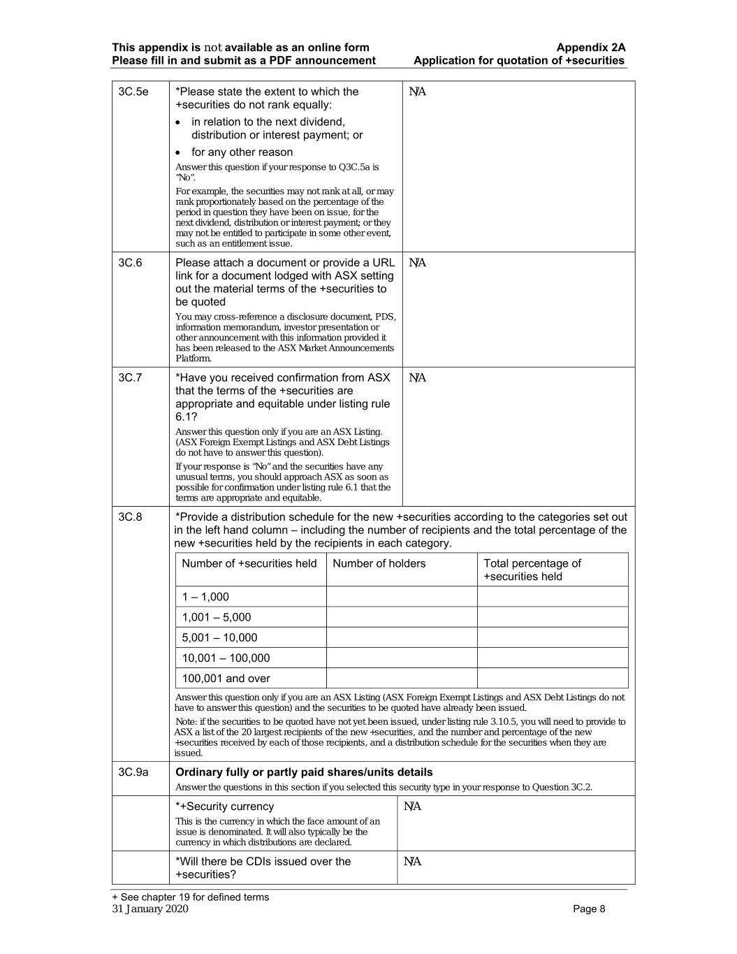 This appendix is not available as an online form Appendix 2A Please fill in and submit as a PDF announcement Application for quotation of +securities 3C.5e *Please state the extent to which the N/A +securities do not rank equally: in relation to the next dividend, distribution or interest payment; or for any other reason Answer this question if your response to Q3C.5a is “No”. For example, the securities may not rank at all, or may rank proportionately based on the percentage of the period in question they have been on issue, for the next dividend, distribution or interest payment; or they may not be entitled to participate in some other event, such as an entitlement issue. 3C.6 Please attach a document or provide a URL N/A link for a document lodged with ASX setting out the material terms of the +securities to be quoted You may cross-reference a disclosure document, PDS, information memorandum, investor presentation or other announcement with this information provided it has been released to the ASX Market Announcements Platform. 3C.7 *Have you received confirmation from ASX N/A that the terms of the +securities are appropriate and equitable under listing rule 6.1? Answer this question only if you are an ASX Listing. (ASX Foreign Exempt Listings and ASX Debt Listings do not have to answer this question). If your response is “No” and the securities have any unusual terms, you should approach ASX as soon as possible for confirmation under listing rule 6.1 that the terms are appropriate and equitable. 3C.8 *Provide a distribution schedule for the new +securities according to the categories set out in the left hand column – including the number of recipients and the total percentage of the new +securities held by the recipients in each category. Number of +securities held Number of holders Total percentage of +securities held 1 – 1,000 1,001 – 5,000 5,001 – 10,000 10,001 – 100,000 100,001 and over Answer this question only if you are an ASX Listing (ASX Foreign Exempt Listings and ASX Debt Listings do not have to answer this question) and the securities to be quoted have already been issued. Note: if the securities to be quoted have not yet been issued, under listing rule 3.10.5, you will need to provide to ASX a list of the 20 largest recipients of the new +securities, and the number and percentage of the new +securities received by each of those recipients, and a distribution schedule for the securities when they are issued. 3C.9a Ordinary fully or partly paid shares/units details Answer the questions in this section if you selected this security type in your response to Question 3C.2. *+Security currency N/A This is the currency in which the face amount of an issue is denominated. It will also typically be the currency in which distributions are declared. *Will there be CDIs issued over the N/A +securities? + See chapter 19 for defined terms 31 January 2020 Page 8