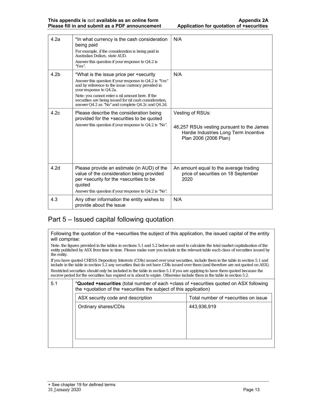 This appendix is not available as an online form Appendix 2A Please fill in and submit as a PDF announcement Application for quotation of +securities 4.2a *In what currency is the cash consideration N/A being paid For example, if the consideration is being paid in Australian Dollars, state AUD. Answer this question if your response to Q4.2 is “Yes”. 4.2b *What is the issue price per +security N/A Answer this question if your response to Q4.2 is “Yes” and by reference to the issue currency provided in your response to Q4.2a. Note: you cannot enter a nil amount here. If the securities are being issued for nil cash consideration, answer Q4.2 as “No” and complete Q4.2c and Q4.2d. 4.2c Please describe the consideration being Vesting of RSUs: provided for the +securities to be quoted Answer this question if your response to Q4.2 is “No”. 46,257 RSUs vesting pursuant to the James Hardie Industries Long Term Incentive Plan 2006 (2006 Plan) 4.2d Please provide an estimate (in AUD) of the An amount equal to the average trading value of the consideration being provided price of securities on 18 September per +security for the +securities to be 2020 quoted Answer this question if your response to Q4.2 is “No”. 4.3 Any other information the entity wishes to N/A provide about the issue Part 5 – Issued capital following quotation Following the quotation of the +securities the subject of this application, the issued capital of the entity will comprise: Note: the figures provided in the tables in sections 5.1 and 5.2 below are used to calculate the total market capitalisation of the entity published by ASX from time to time. Please make sure you include in the relevant table each class of securities issued by the entity. If you have quoted CHESS Depository Interests (CDIs) issued over your securities, include them in the table in section 5.1 and include in the table in section 5.2 any securities that do not have CDIs issued over them (and therefore are not quoted on ASX). Restricted securities should only be included in the table in section 5.1 if you are applying to have them quoted because the escrow period for the securities has expired or is about to expire. Otherwise include them in the table in section 5.2. 5.1 *Quoted +securities (total number of each +class of +securities quoted on ASX following the +quotation of the +securities the subject of this application) ASX security code and description Total number of +securities on issue Ordinary shares/CDIs 443,936,919 + See chapter 19 for defined terms 31 January 2020 Page 13