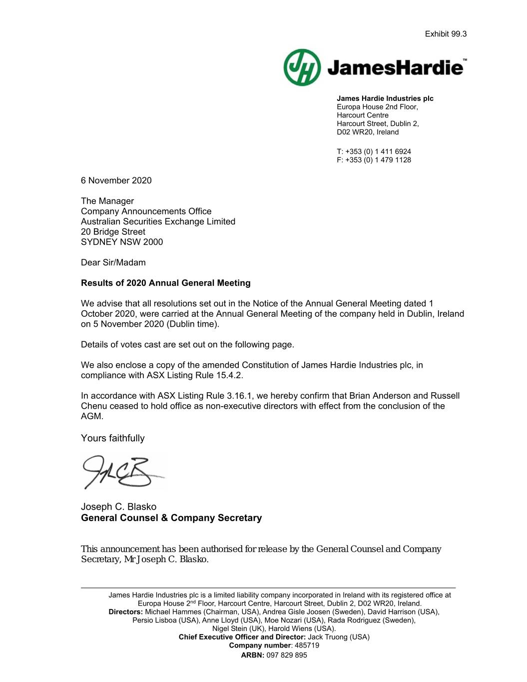 Exhibit 99.3 James Hardie Industries plc Europa House 2nd Floor, Harcourt Centre Harcourt Street, Dublin 2, D02 WR20, Ireland T: +353 (0) 1 411 6924 F: +353 (0) 1 479 1128 6 November 2020 The Manager Company Announcements Office Australian Securities Exchange Limited 20 Bridge Street SYDNEY NSW 2000 Dear Sir/Madam Results of 2020 Annual General Meeting We advise that all resolutions set out in the Notice of the Annual General Meeting dated 1 October 2020, were carried at the Annual General Meeting of the company held in Dublin, Ireland on 5 November 2020 (Dublin time). Details of votes cast are set out on the following page. We also enclose a copy of the amended Constitution of James Hardie Industries plc, in compliance with ASX Listing Rule 15.4.2. In accordance with ASX Listing Rule 3.16.1, we hereby confirm that Brian Anderson and Russell Chenu ceased to hold office as non-executive directors with effect from the conclusion of the AGM. Yours faithfully Joseph C. Blasko General Counsel & Company Secretary This announcement has been authorised for release by the General Counsel and Company Secretary, Mr Joseph C. Blasko. James Hardie Industries plc is a limited liability company incorporated in Ireland with its registered office at Europa House 2nd Floor, Harcourt Centre, Harcourt Street, Dublin 2, D02 WR20, Ireland. Directors: Michael Hammes (Chairman, USA), Andrea Gisle Joosen (Sweden), David Harrison (USA), Persio Lisboa (USA), Anne Lloyd (USA), Moe Nozari (USA), Rada Rodriguez (Sweden), Nigel Stein (UK), Harold Wiens (USA). Chief Executive Officer and Director: Jack Truong (USA) Company number: 485719 ARBN: 097 829 895