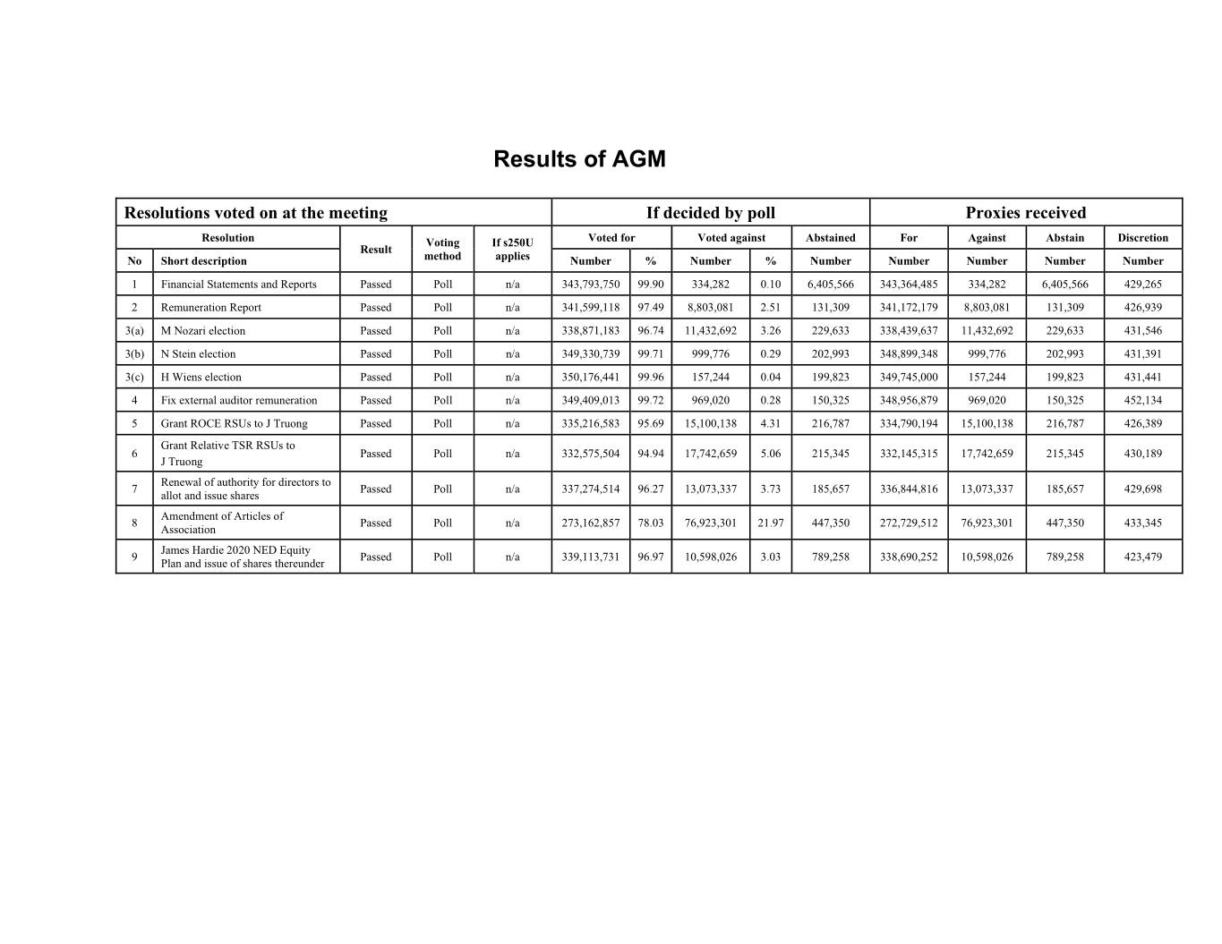 Results of AGM Resolutions voted on at the meeting If decided by poll Proxies received Resolution Voting If s250U Voted for Voted against Abstained For Against Abstain Discretion Result No Short description method applies Number % Number % Number Number Number Number Number 1 Financial Statements and Reports Passed Poll n/a 343,793,750 99.90 334,282 0.10 6,405,566 343,364,485 334,282 6,405,566 429,265 2 Remuneration Report Passed Poll n/a 341,599,118 97.49 8,803,081 2.51 131,309 341,172,179 8,803,081 131,309 426,939 3(a) M Nozari election Passed Poll n/a 338,871,183 96.74 11,432,692 3.26 229,633 338,439,637 11,432,692 229,633 431,546 3(b) N Stein election Passed Poll n/a 349,330,739 99.71 999,776 0.29 202,993 348,899,348 999,776 202,993 431,391 3(c) H Wiens election Passed Poll n/a 350,176,441 99.96 157,244 0.04 199,823 349,745,000 157,244 199,823 431,441 4 Fix external auditor remuneration Passed Poll n/a 349,409,013 99.72 969,020 0.28 150,325 348,956,879 969,020 150,325 452,134 5 Grant ROCE RSUs to J Truong Passed Poll n/a 335,216,583 95.69 15,100,138 4.31 216,787 334,790,194 15,100,138 216,787 426,389 Grant Relative TSR RSUs to 6 Passed Poll n/a 332,575,504 94.94 17,742,659 5.06 215,345 332,145,315 17,742,659 215,345 430,189 J Truong Renewal of authority for directors to 7 Passed Poll n/a 337,274,514 96.27 13,073,337 3.73 185,657 336,844,816 13,073,337 185,657 429,698 allot and issue shares Amendment of Articles of 8 Passed Poll n/a 273,162,857 78.03 76,923,301 21.97 447,350 272,729,512 76,923,301 447,350 433,345 Association James Hardie 2020 NED Equity 9 Passed Poll n/a 339,113,731 96.97 10,598,026 3.03 789,258 338,690,252 10,598,026 789,258 423,479 Plan and issue of shares thereunder