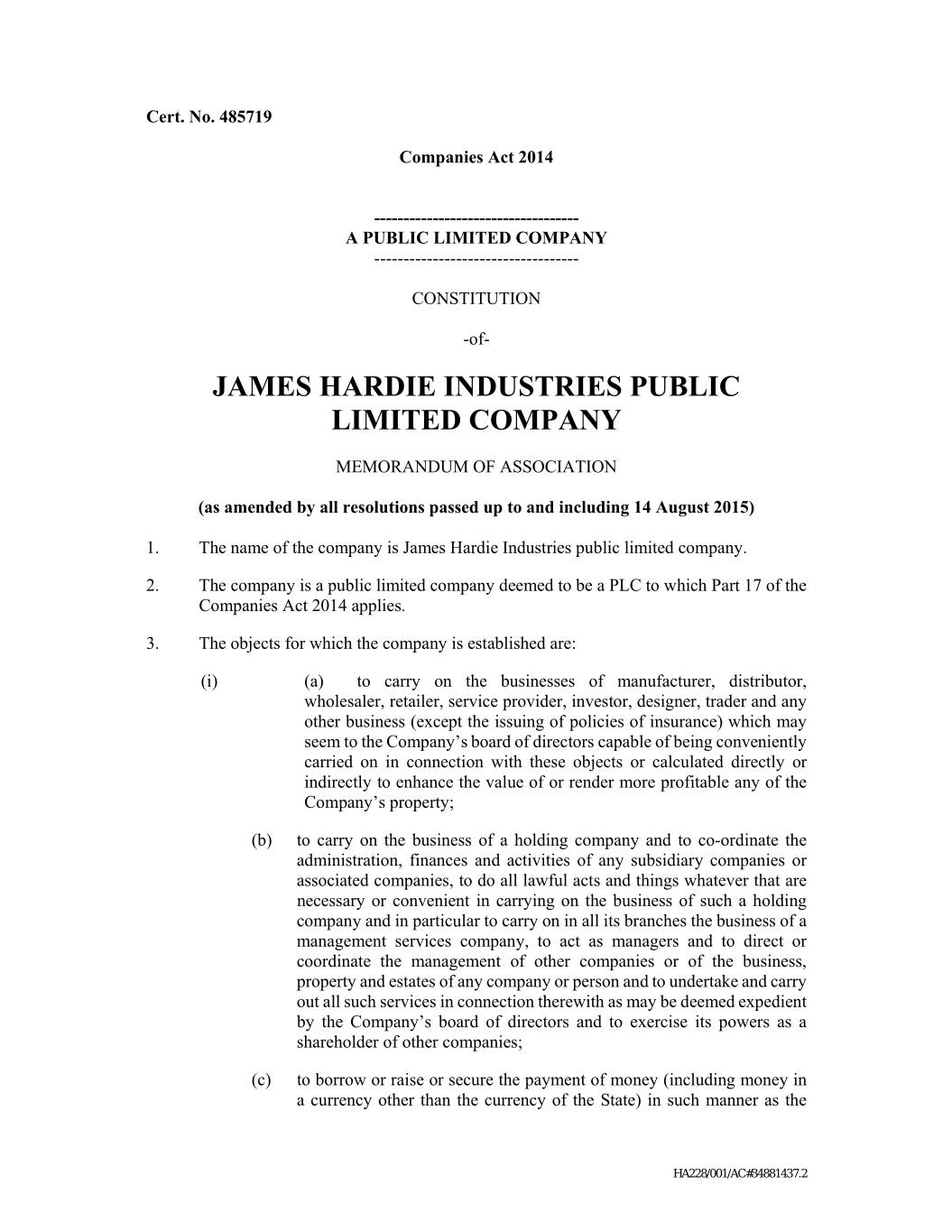 Cert. No. 485719 Companies Act 2014 ----------------------------------- A PUBLIC LIMITED COMPANY ----------------------------------- CONSTITUTION -of- JAMES HARDIE INDUSTRIES PUBLIC LIMITED COMPANY MEMORANDUM OF ASSOCIATION (as amended by all resolutions passed up to and including 14 August 2015) 1. The name of the company is James Hardie Industries public limited company. 2. The company is a public limited company deemed to be a PLC to which Part 17 of the Companies Act 2014 applies. 3. The objects for which the company is established are: (i) (a) to carry on the businesses of manufacturer, distributor, wholesaler, retailer, service provider, investor, designer, trader and any other business (except the issuing of policies of insurance) which may seem to the Company’s board of directors capable of being conveniently carried on in connection with these objects or calculated directly or indirectly to enhance the value of or render more profitable any of the Company’s property; (b) to carry on the business of a holding company and to co-ordinate the administration, finances and activities of any subsidiary companies or associated companies, to do all lawful acts and things whatever that are necessary or convenient in carrying on the business of such a holding company and in particular to carry on in all its branches the business of a management services company, to act as managers and to direct or coordinate the management of other companies or of the business, property and estates of any company or person and to undertake and carry out all such services in connection therewith as may be deemed expedient by the Company’s board of directors and to exercise its powers as a shareholder of other companies; (c) to borrow or raise or secure the payment of money (including money in a currency other than the currency of the State) in such manner as the HA228/001/AC#34881437.2