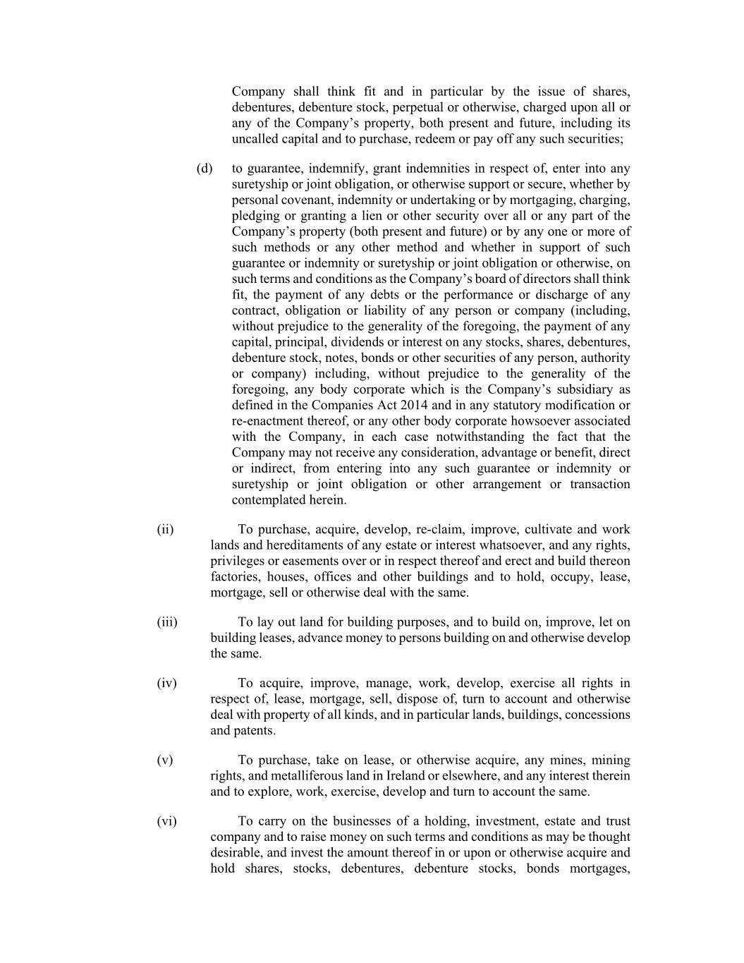 Company shall think fit and in particular by the issue of shares, debentures, debenture stock, perpetual or otherwise, charged upon all or any of the Company’s property, both present and future, including its uncalled capital and to purchase, redeem or pay off any such securities; (d) to guarantee, indemnify, grant indemnities in respect of, enter into any suretyship or joint obligation, or otherwise support or secure, whether by personal covenant, indemnity or undertaking or by mortgaging, charging, pledging or granting a lien or other security over all or any part of the Company’s property (both present and future) or by any one or more of such methods or any other method and whether in support of such guarantee or indemnity or suretyship or joint obligation or otherwise, on such terms and conditions as the Company’s board of directors shall think fit, the payment of any debts or the performance or discharge of any contract, obligation or liability of any person or company (including, without prejudice to the generality of the foregoing, the payment of any capital, principal, dividends or interest on any stocks, shares, debentures, debenture stock, notes, bonds or other securities of any person, authority or company) including, without prejudice to the generality of the foregoing, any body corporate which is the Company’s subsidiary as defined in the Companies Act 2014 and in any statutory modification or re-enactment thereof, or any other body corporate howsoever associated with the Company, in each case notwithstanding the fact that the Company may not receive any consideration, advantage or benefit, direct or indirect, from entering into any such guarantee or indemnity or suretyship or joint obligation or other arrangement or transaction contemplated herein. (ii) To purchase, acquire, develop, re-claim, improve, cultivate and work lands and hereditaments of any estate or interest whatsoever, and any rights, privileges or easements over or in respect thereof and erect and build thereon factories, houses, offices and other buildings and to hold, occupy, lease, mortgage, sell or otherwise deal with the same. (iii) To lay out land for building purposes, and to build on, improve, let on building leases, advance money to persons building on and otherwise develop the same. (iv) To acquire, improve, manage, work, develop, exercise all rights in respect of, lease, mortgage, sell, dispose of, turn to account and otherwise deal with property of all kinds, and in particular lands, buildings, concessions and patents. (v) To purchase, take on lease, or otherwise acquire, any mines, mining rights, and metalliferous land in Ireland or elsewhere, and any interest therein and to explore, work, exercise, develop and turn to account the same. (vi) To carry on the businesses of a holding, investment, estate and trust company and to raise money on such terms and conditions as may be thought desirable, and invest the amount thereof in or upon or otherwise acquire and hold shares, stocks, debentures, debenture stocks, bonds mortgages,