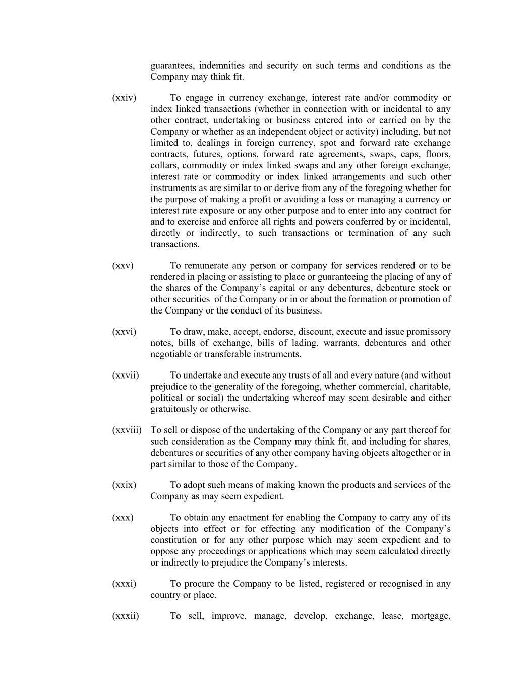 guarantees, indemnities and security on such terms and conditions as the Company may think fit. (xxiv) To engage in currency exchange, interest rate and/or commodity or index linked transactions (whether in connection with or incidental to any other contract, undertaking or business entered into or carried on by the Company or whether as an independent object or activity) including, but not limited to, dealings in foreign currency, spot and forward rate exchange contracts, futures, options, forward rate agreements, swaps, caps, floors, collars, commodity or index linked swaps and any other foreign exchange, interest rate or commodity or index linked arrangements and such other instruments as are similar to or derive from any of the foregoing whether for the purpose of making a profit or avoiding a loss or managing a currency or interest rate exposure or any other purpose and to enter into any contract for and to exercise and enforce all rights and powers conferred by or incidental, directly or indirectly, to such transactions or termination of any such transactions. (xxv) To remunerate any person or company for services rendered or to be rendered in placing or assisting to place or guaranteeing the placing of any of the shares of the Company’s capital or any debentures, debenture stock or other securities of the Company or in or about the formation or promotion of the Company or the conduct of its business. (xxvi) To draw, make, accept, endorse, discount, execute and issue promissory notes, bills of exchange, bills of lading, warrants, debentures and other negotiable or transferable instruments. (xxvii) To undertake and execute any trusts of all and every nature (and without prejudice to the generality of the foregoing, whether commercial, charitable, political or social) the undertaking whereof may seem desirable and either gratuitously or otherwise. (xxviii) To sell or dispose of the undertaking of the Company or any part thereof for such consideration as the Company may think fit, and including for shares, debentures or securities of any other company having objects altogether or in part similar to those of the Company. (xxix) To adopt such means of making known the products and services of the Company as may seem expedient. (xxx) To obtain any enactment for enabling the Company to carry any of its objects into effect or for effecting any modification of the Company’s constitution or for any other purpose which may seem expedient and to oppose any proceedings or applications which may seem calculated directly or indirectly to prejudice the Company’s interests. (xxxi) To procure the Company to be listed, registered or recognised in any country or place. (xxxii) To sell, improve, manage, develop, exchange, lease, mortgage,