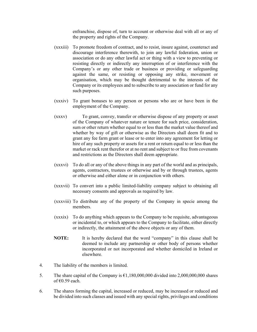 enfranchise, dispose of, turn to account or otherwise deal with all or any of the property and rights of the Company. (xxxiii) To promote freedom of contract, and to resist, insure against, counteract and discourage interference therewith, to join any lawful federation, union or association or do any other lawful act or thing with a view to preventing or resisting directly or indirectly any interruption of or interference with the Company’s or any other trade or business or providing or safeguarding against the same, or resisting or opposing any strike, movement or organisation, which may be thought detrimental to the interests of the Company or its employees and to subscribe to any association or fund for any such purposes. (xxxiv) To grant bonuses to any person or persons who are or have been in the employment of the Company. (xxxv) To grant, convey, transfer or otherwise dispose of any property or asset of the Company of whatever nature or tenure for such price, consideration, sum or other return whether equal to or less than the market value thereof and whether by way of gift or otherwise as the Directors shall deem fit and to grant any fee farm grant or lease or to enter into any agreement for letting or hire of any such property or assets for a rent or return equal to or less than the market or rack rent therefor or at no rent and subject to or free from covenants and restrictions as the Directors shall deem appropriate. (xxxvi) To do all or any of the above things in any part of the world and as principals, agents, contractors, trustees or otherwise and by or through trustees, agents or otherwise and either alone or in conjunction with others. (xxxvii) To convert into a public limited-liability company subject to obtaining all necessary consents and approvals as required by law. (xxxviii) To distribute any of the property of the Company in specie among the members. (xxxix) To do anything which appears to the Company to be requisite, advantageous or incidental to, or which appears to the Company to facilitate, either directly or indirectly, the attainment of the above objects or any of them. NOTE: It is hereby declared that the word “company” in this clause shall be deemed to include any partnership or other body of persons whether incorporated or not incorporated and whether domiciled in Ireland or elsewhere. 4. The liability of the members is limited. 5. The share capital of the Company is €1,180,000,000 divided into 2,000,000,000 shares of €0.59 each. 6. The shares forming the capital, increased or reduced, may be increased or reduced and be divided into such classes and issued with any special rights, privileges and conditions