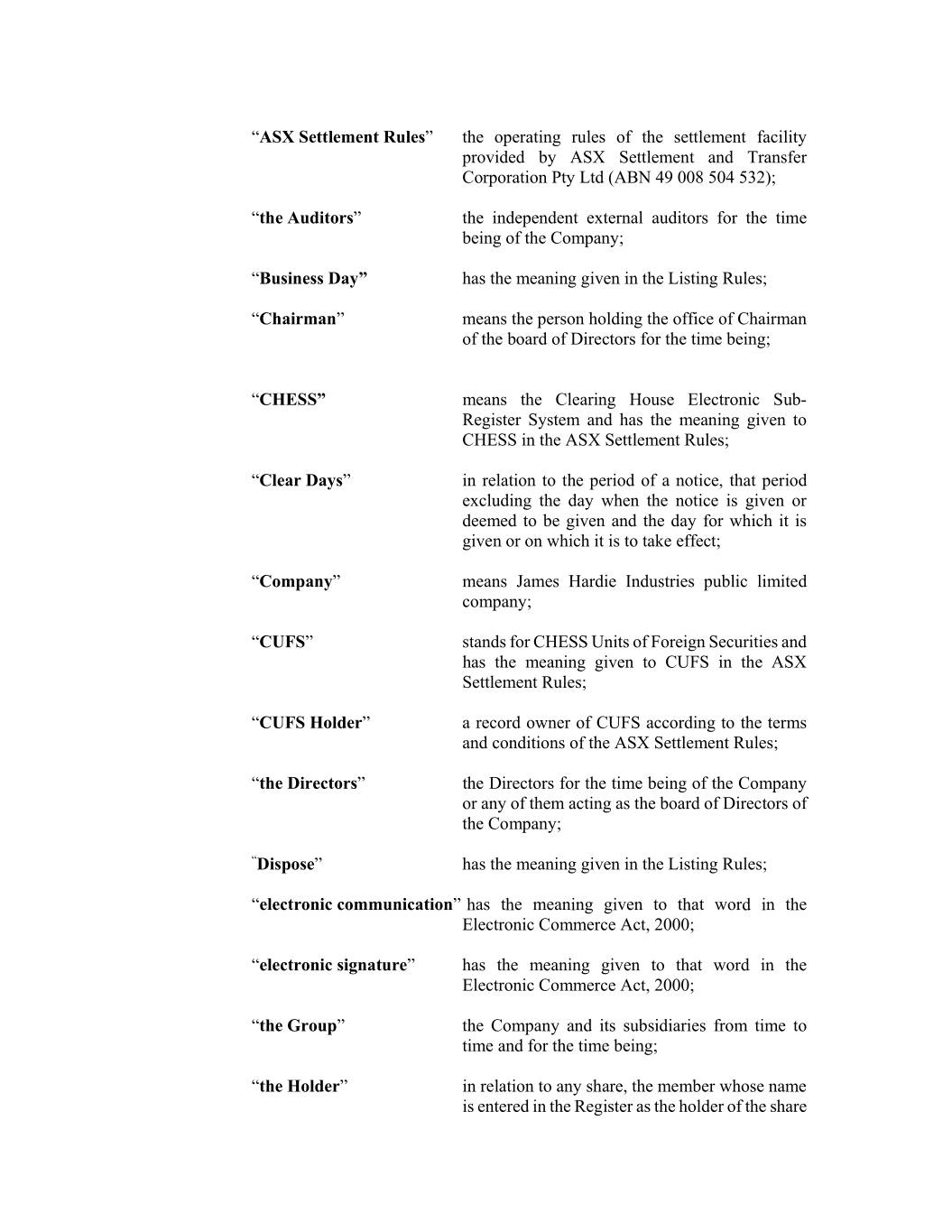 “ASX Settlement Rules” the operating rules of the settlement facility provided by ASX Settlement and Transfer Corporation Pty Ltd (ABN 49 008 504 532); “the Auditors” the independent external auditors for the time being of the Company; “Business Day” has the meaning given in the Listing Rules; “Chairman” means the person holding the office of Chairman of the board of Directors for the time being; “CHESS” means the Clearing House Electronic Sub- Register System and has the meaning given to CHESS in the ASX Settlement Rules; “Clear Days” in relation to the period of a notice, that period excluding the day when the notice is given or deemed to be given and the day for which it is given or on which it is to take effect; “Company” means James Hardie Industries public limited company; “CUFS” stands for CHESS Units of Foreign Securities and has the meaning given to CUFS in the ASX Settlement Rules; “CUFS Holder” a record owner of CUFS according to the terms and conditions of the ASX Settlement Rules; “the Directors” the Directors for the time being of the Company or any of them acting as the board of Directors of the Company; “Dispose” has the meaning given in the Listing Rules; “electronic communication” has the meaning given to that word in the Electronic Commerce Act, 2000; “electronic signature” has the meaning given to that word in the Electronic Commerce Act, 2000; “the Group” the Company and its subsidiaries from time to time and for the time being; “the Holder” in relation to any share, the member whose name is entered in the Register as the holder of the share