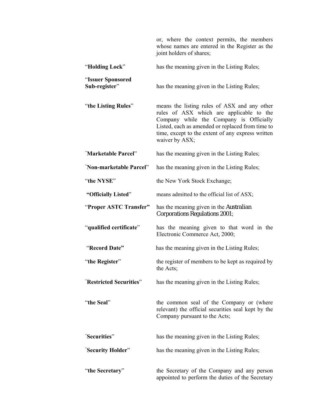 or, where the context permits, the members whose names are entered in the Register as the joint holders of shares; “Holding Lock” has the meaning given in the Listing Rules; “Issuer Sponsored Sub-register” has the meaning given in the Listing Rules; “the Listing Rules” means the listing rules of ASX and any other rules of ASX which are applicable to the Company while the Company is Officially Listed, each as amended or replaced from time to time, except to the extent of any express written waiver by ASX; “Marketable Parcel” has the meaning given in the Listing Rules; “Non-marketable Parcel” has the meaning given in the Listing Rules; “the NYSE” the New York Stock Exchange; “Officially Listed” means admitted to the official list of ASX; “Proper ASTC Transfer” has the meaning given in the Australian Corporations Regulations 2001; “qualified certificate” has the meaning given to that word in the Electronic Commerce Act, 2000; “Record Date” has the meaning given in the Listing Rules; “the Register” the register of members to be kept as required by the Acts; “Restricted Securities” has the meaning given in the Listing Rules; “the Seal” the common seal of the Company or (where relevant) the official securities seal kept by the Company pursuant to the Acts; “Securities” has the meaning given in the Listing Rules; “Security Holder” has the meaning given in the Listing Rules; “the Secretary” the Secretary of the Company and any person appointed to perform the duties of the Secretary