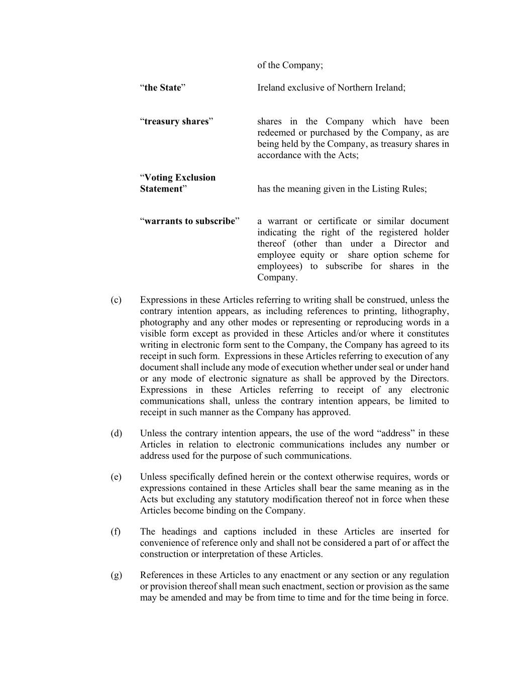 of the Company; “the State” Ireland exclusive of Northern Ireland; “treasury shares” shares in the Company which have been redeemed or purchased by the Company, as are being held by the Company, as treasury shares in accordance with the Acts; “Voting Exclusion Statement” has the meaning given in the Listing Rules; “warrants to subscribe” a warrant or certificate or similar document indicating the right of the registered holder thereof (other than under a Director and employee equity or share option scheme for employees) to subscribe for shares in the Company. (c) Expressions in these Articles referring to writing shall be construed, unless the contrary intention appears, as including references to printing, lithography, photography and any other modes or representing or reproducing words in a visible form except as provided in these Articles and/or where it constitutes writing in electronic form sent to the Company, the Company has agreed to its receipt in such form. Expressions in these Articles referring to execution of any document shall include any mode of execution whether under seal or under hand or any mode of electronic signature as shall be approved by the Directors. Expressions in these Articles referring to receipt of any electronic communications shall, unless the contrary intention appears, be limited to receipt in such manner as the Company has approved. (d) Unless the contrary intention appears, the use of the word “address” in these Articles in relation to electronic communications includes any number or address used for the purpose of such communications. (e) Unless specifically defined herein or the context otherwise requires, words or expressions contained in these Articles shall bear the same meaning as in the Acts but excluding any statutory modification thereof not in force when these Articles become binding on the Company. (f) The headings and captions included in these Articles are inserted for convenience of reference only and shall not be considered a part of or affect the construction or interpretation of these Articles. (g) References in these Articles to any enactment or any section or any regulation or provision thereof shall mean such enactment, section or provision as the same may be amended and may be from time to time and for the time being in force.