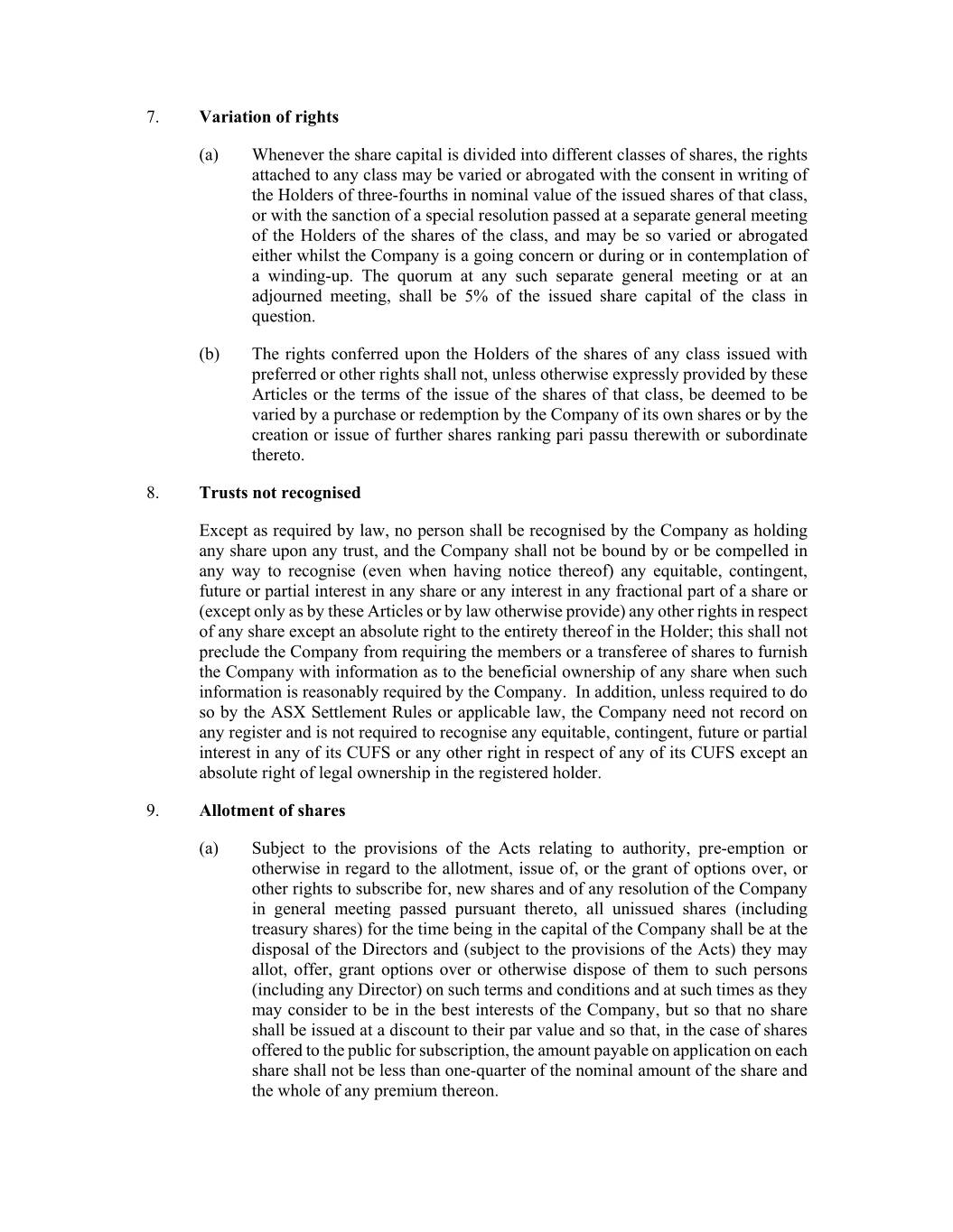 7. Variation of rights (a) Whenever the share capital is divided into different classes of shares, the rights attached to any class may be varied or abrogated with the consent in writing of the Holders of three-fourths in nominal value of the issued shares of that class, or with the sanction of a special resolution passed at a separate general meeting of the Holders of the shares of the class, and may be so varied or abrogated either whilst the Company is a going concern or during or in contemplation of a winding-up. The quorum at any such separate general meeting or at an adjourned meeting, shall be 5% of the issued share capital of the class in question. (b) The rights conferred upon the Holders of the shares of any class issued with preferred or other rights shall not, unless otherwise expressly provided by these Articles or the terms of the issue of the shares of that class, be deemed to be varied by a purchase or redemption by the Company of its own shares or by the creation or issue of further shares ranking pari passu therewith or subordinate thereto. 8. Trusts not recognised Except as required by law, no person shall be recognised by the Company as holding any share upon any trust, and the Company shall not be bound by or be compelled in any way to recognise (even when having notice thereof) any equitable, contingent, future or partial interest in any share or any interest in any fractional part of a share or (except only as by these Articles or by law otherwise provide) any other rights in respect of any share except an absolute right to the entirety thereof in the Holder; this shall not preclude the Company from requiring the members or a transferee of shares to furnish the Company with information as to the beneficial ownership of any share when such information is reasonably required by the Company. In addition, unless required to do so by the ASX Settlement Rules or applicable law, the Company need not record on any register and is not required to recognise any equitable, contingent, future or partial interest in any of its CUFS or any other right in respect of any of its CUFS except an absolute right of legal ownership in the registered holder. 9. Allotment of shares (a) Subject to the provisions of the Acts relating to authority, pre-emption or otherwise in regard to the allotment, issue of, or the grant of options over, or other rights to subscribe for, new shares and of any resolution of the Company in general meeting passed pursuant thereto, all unissued shares (including treasury shares) for the time being in the capital of the Company shall be at the disposal of the Directors and (subject to the provisions of the Acts) they may allot, offer, grant options over or otherwise dispose of them to such persons (including any Director) on such terms and conditions and at such times as they may consider to be in the best interests of the Company, but so that no share shall be issued at a discount to their par value and so that, in the case of shares offered to the public for subscription, the amount payable on application on each share shall not be less than one-quarter of the nominal amount of the share and the whole of any premium thereon.