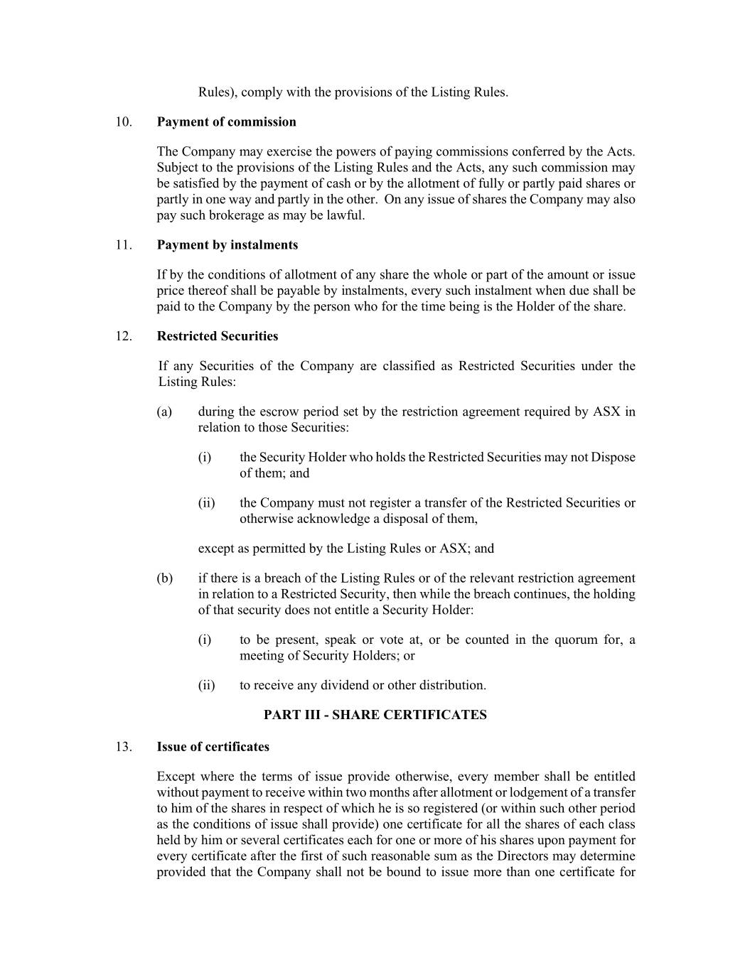 Rules), comply with the provisions of the Listing Rules. 10. Payment of commission The Company may exercise the powers of paying commissions conferred by the Acts. Subject to the provisions of the Listing Rules and the Acts, any such commission may be satisfied by the payment of cash or by the allotment of fully or partly paid shares or partly in one way and partly in the other. On any issue of shares the Company may also pay such brokerage as may be lawful. 11. Payment by instalments If by the conditions of allotment of any share the whole or part of the amount or issue price thereof shall be payable by instalments, every such instalment when due shall be paid to the Company by the person who for the time being is the Holder of the share. 12. Restricted Securities If any Securities of the Company are classified as Restricted Securities under the Listing Rules: (a) during the escrow period set by the restriction agreement required by ASX in relation to those Securities: (i) the Security Holder who holds the Restricted Securities may not Dispose of them; and (ii) the Company must not register a transfer of the Restricted Securities or otherwise acknowledge a disposal of them, except as permitted by the Listing Rules or ASX; and (b) if there is a breach of the Listing Rules or of the relevant restriction agreement in relation to a Restricted Security, then while the breach continues, the holding of that security does not entitle a Security Holder: (i) to be present, speak or vote at, or be counted in the quorum for, a meeting of Security Holders; or (ii) to receive any dividend or other distribution. PART III - SHARE CERTIFICATES 13. Issue of certificates Except where the terms of issue provide otherwise, every member shall be entitled without payment to receive within two months after allotment or lodgement of a transfer to him of the shares in respect of which he is so registered (or within such other period as the conditions of issue shall provide) one certificate for all the shares of each class held by him or several certificates each for one or more of his shares upon payment for every certificate after the first of such reasonable sum as the Directors may determine provided that the Company shall not be bound to issue more than one certificate for