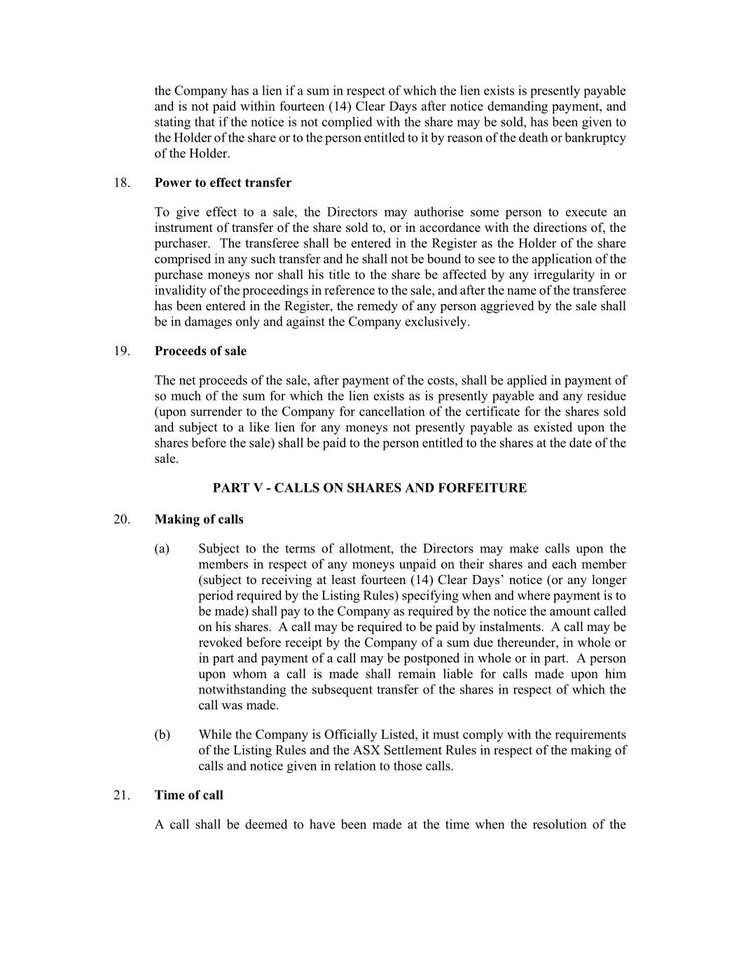 the Company has a lien if a sum in respect of which the lien exists is presently payable and is not paid within fourteen (14) Clear Days after notice demanding payment, and stating that if the notice is not complied with the share may be sold, has been given to the Holder of the share or to the person entitled to it by reason of the death or bankruptcy of the Holder. 18. Power to effect transfer To give effect to a sale, the Directors may authorise some person to execute an instrument of transfer of the share sold to, or in accordance with the directions of, the purchaser. The transferee shall be entered in the Register as the Holder of the share comprised in any such transfer and he shall not be bound to see to the application of the purchase moneys nor shall his title to the share be affected by any irregularity in or invalidity of the proceedings in reference to the sale, and after the name of the transferee has been entered in the Register, the remedy of any person aggrieved by the sale shall be in damages only and against the Company exclusively. 19. Proceeds of sale The net proceeds of the sale, after payment of the costs, shall be applied in payment of so much of the sum for which the lien exists as is presently payable and any residue (upon surrender to the Company for cancellation of the certificate for the shares sold and subject to a like lien for any moneys not presently payable as existed upon the shares before the sale) shall be paid to the person entitled to the shares at the date of the sale. PART V - CALLS ON SHARES AND FORFEITURE 20. Making of calls (a) Subject to the terms of allotment, the Directors may make calls upon the members in respect of any moneys unpaid on their shares and each member (subject to receiving at least fourteen (14) Clear Days’ notice (or any longer period required by the Listing Rules) specifying when and where payment is to be made) shall pay to the Company as required by the notice the amount called on his shares. A call may be required to be paid by instalments. A call may be revoked before receipt by the Company of a sum due thereunder, in whole or in part and payment of a call may be postponed in whole or in part. A person upon whom a call is made shall remain liable for calls made upon him notwithstanding the subsequent transfer of the shares in respect of which the call was made. (b) While the Company is Officially Listed, it must comply with the requirements of the Listing Rules and the ASX Settlement Rules in respect of the making of calls and notice given in relation to those calls. 21. Time of call A call shall be deemed to have been made at the time when the resolution of the